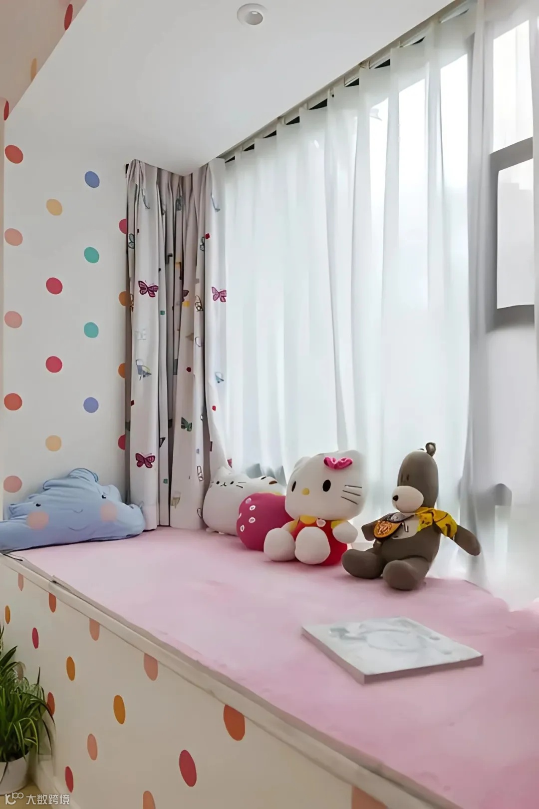 如果想要房间看起来更大气,可以将窗帘和纱帘都装在飘窗所在的墙体或靠近飘窗的顶部,最好覆盖整个墙面。