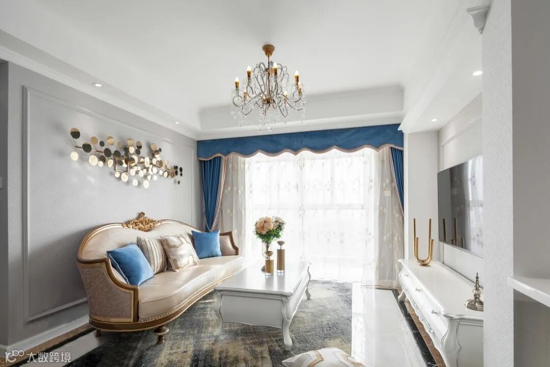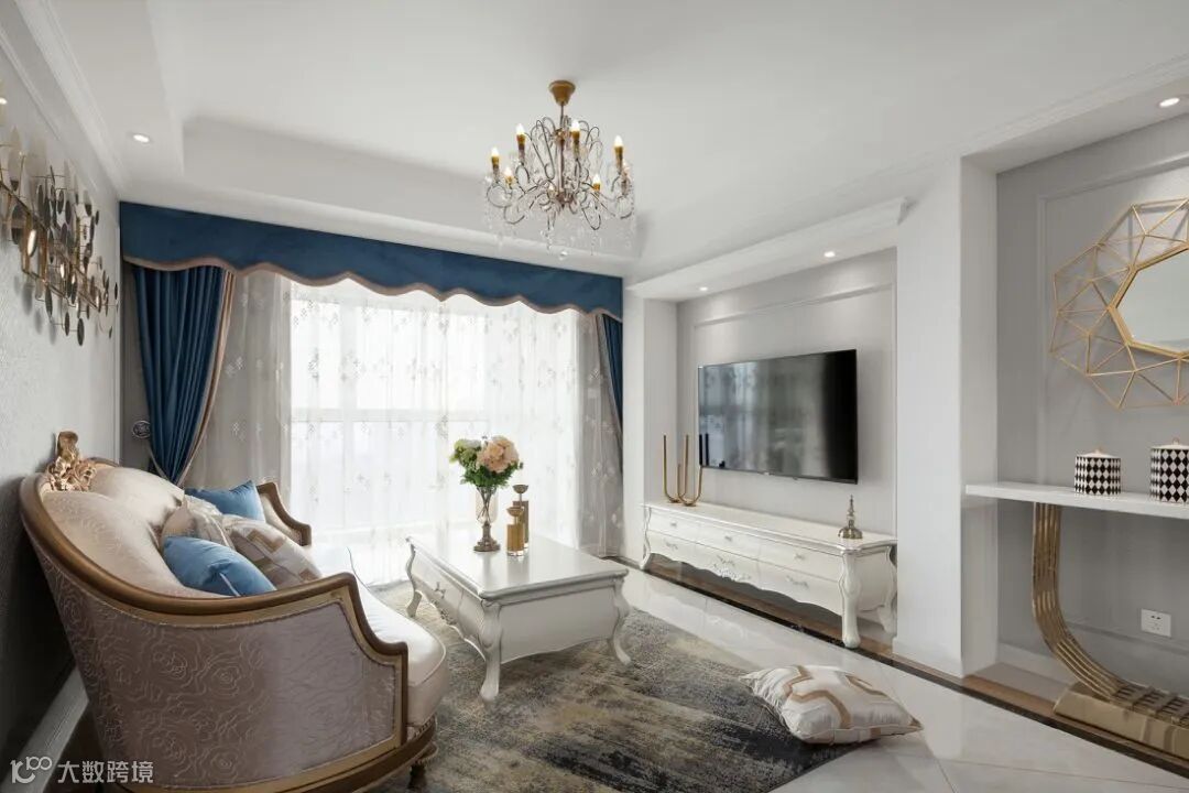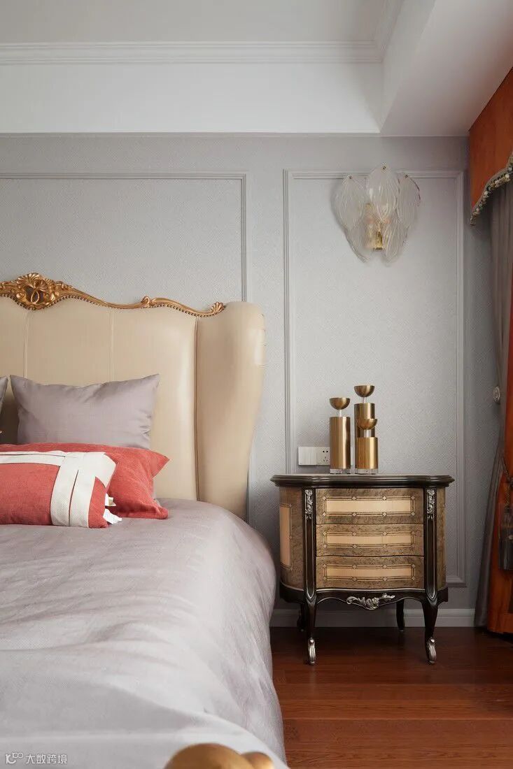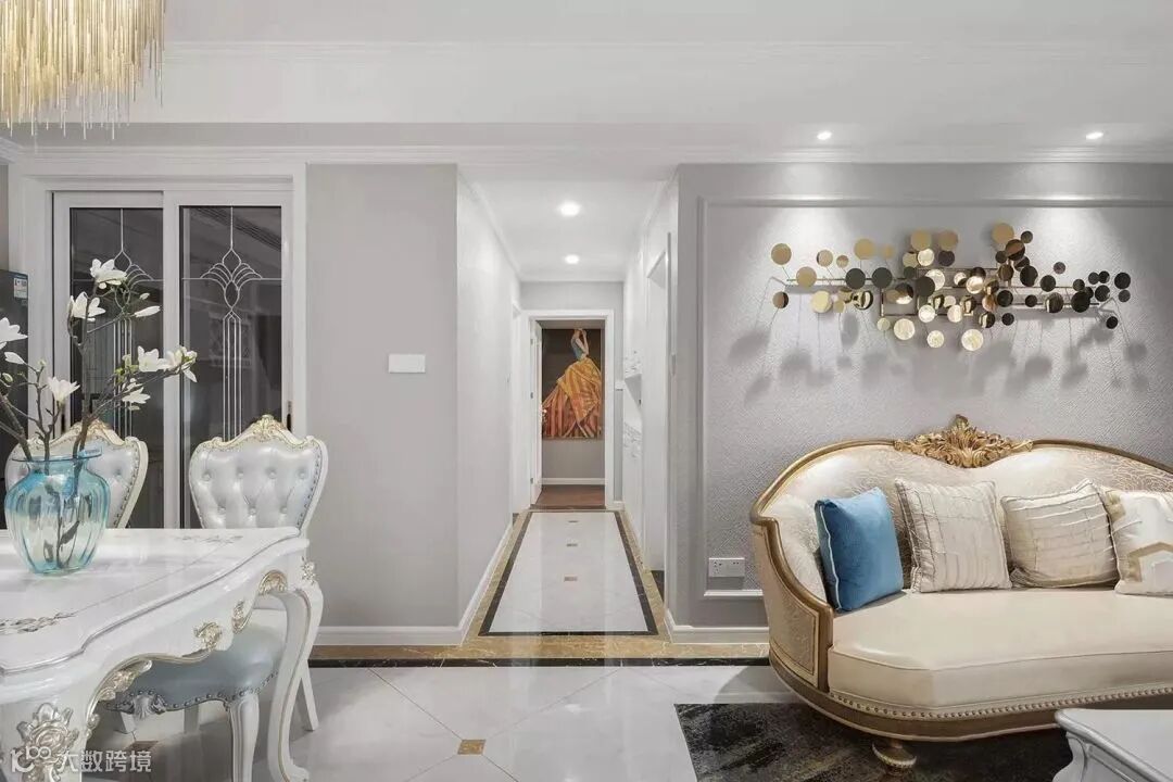 ▲ 墙面选用简洁石膏线条作为装饰,打造整个空间的古典氛围感。金属墙饰与摆件贵气而优雅,符合法式浪漫轻奢风格。
