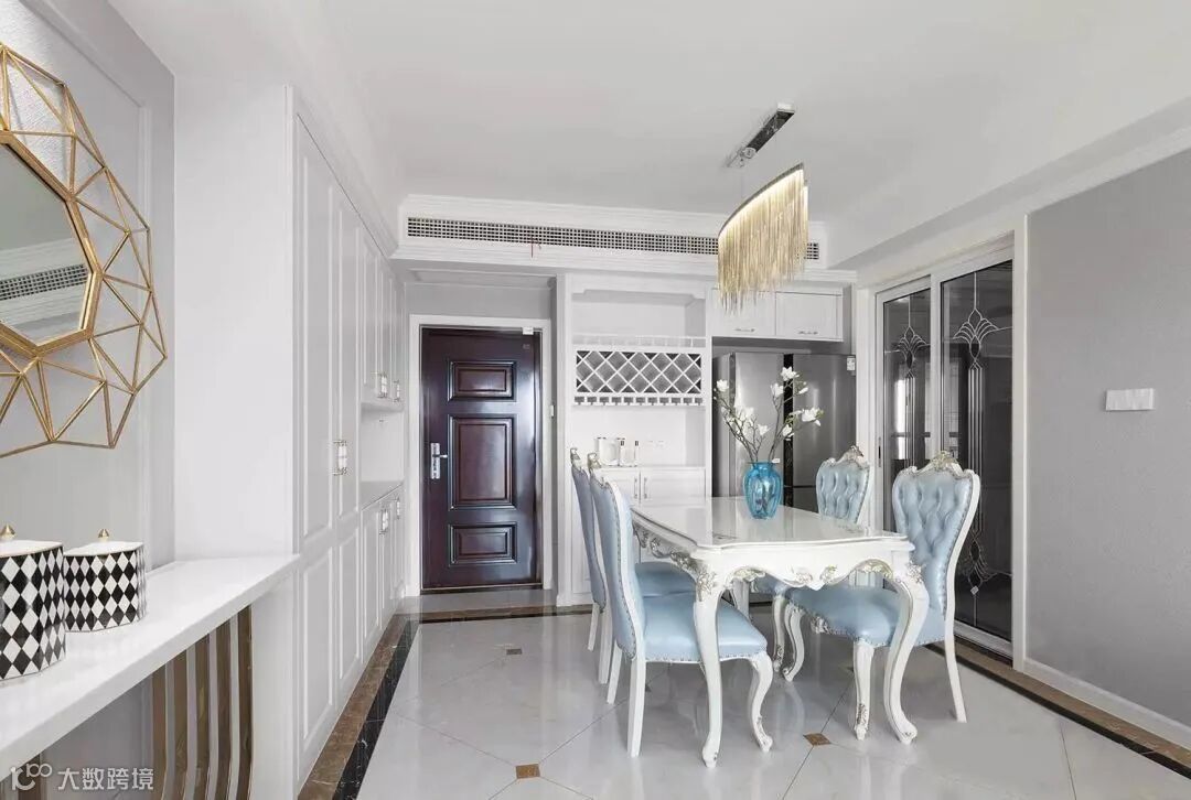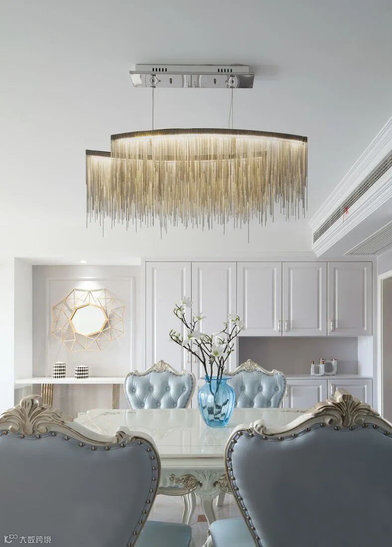 ▲ 端景台上方的墙饰立体感十足,客餐厅都选择了富有轻奢气质的金属吊灯,提升空间质感与精致度。