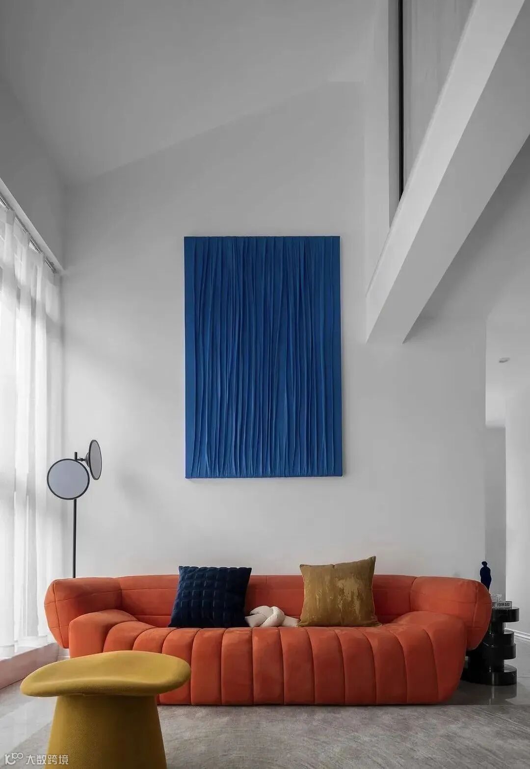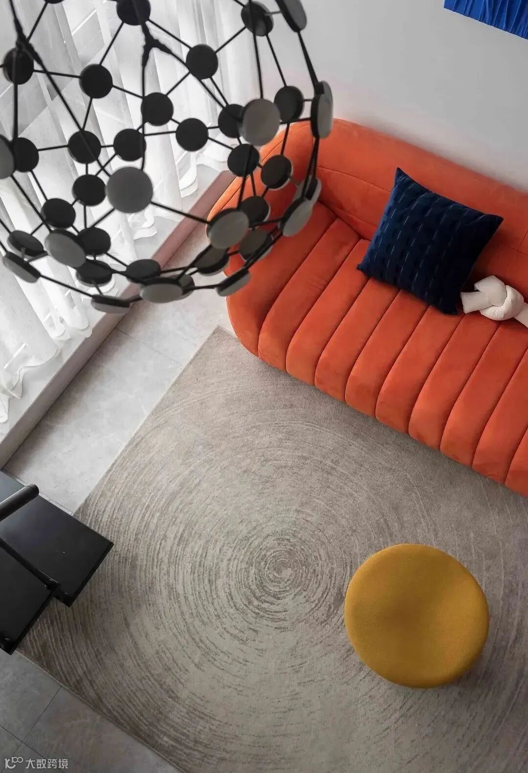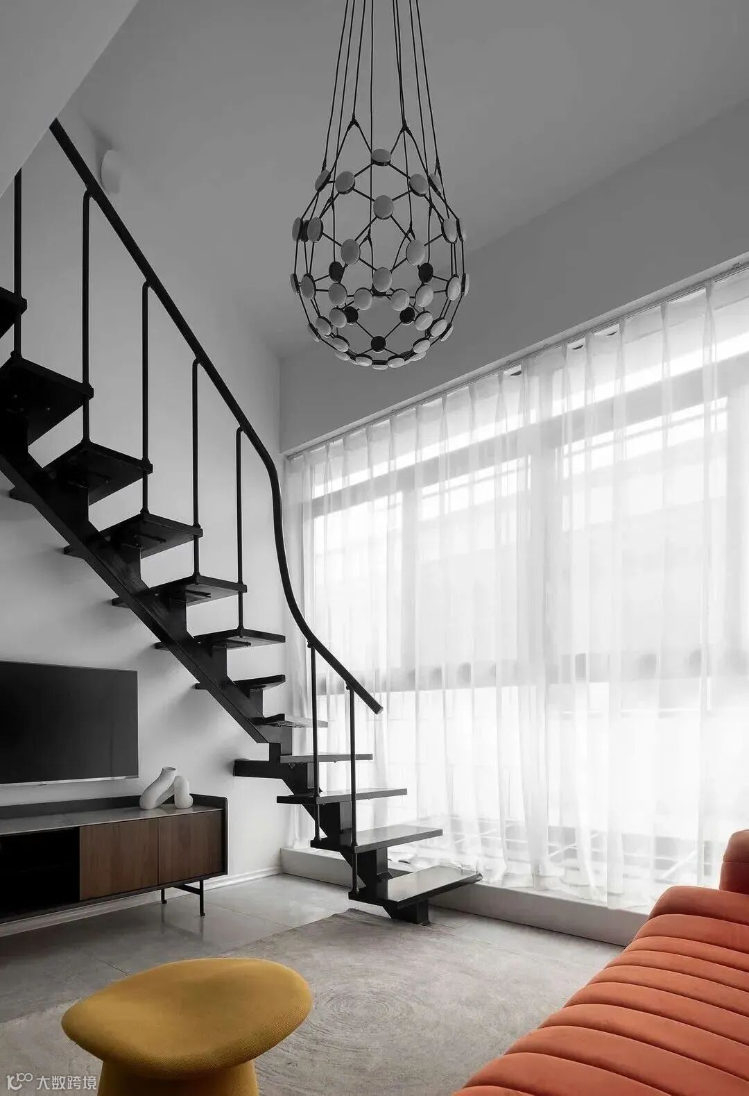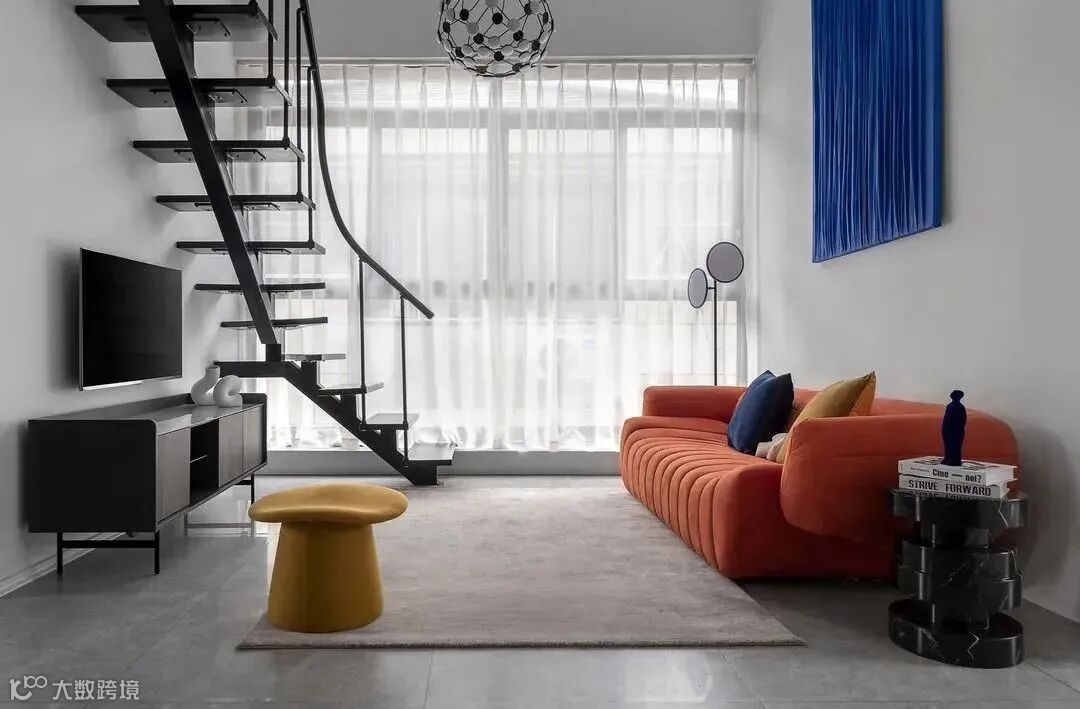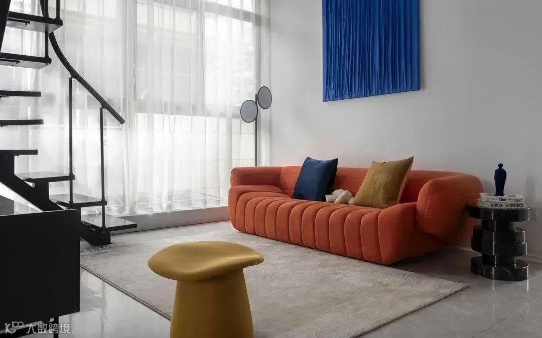 一楼的主要亮点,便是迷你弧形楼梯和相连的客厅,橙色沙发极其具有艺术氛围,配以淡雅黄色的坐凳和咖啡色地毯,将空间的奢华显露得一干二净。