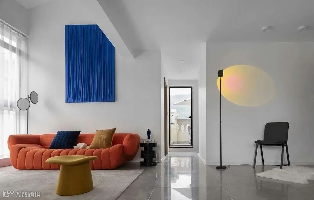 暖色与冷色的结合,高级的丝绒地毯,营造温暖阳光的轻盈复古感。绒布沙发与复古艺术边几裹挟着岁月的韵味,体现主人不拘的个性气质