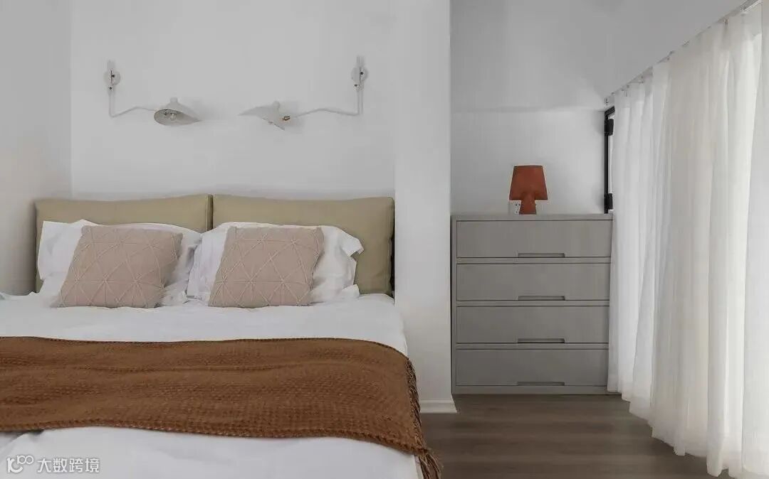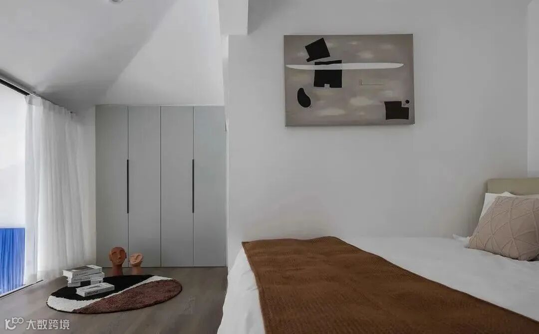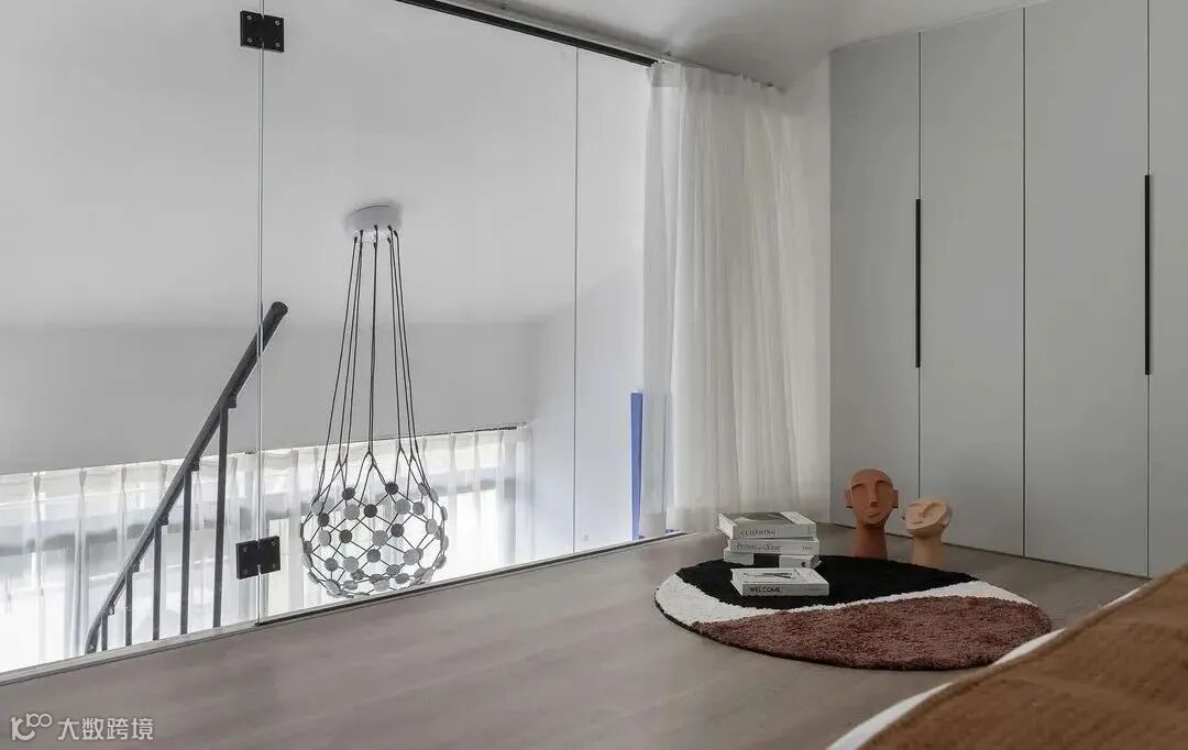 卧室做的玻璃隔断,没有选择用边框,直接玻璃落地,整体效果简洁开阔,需要时再拉上卧室内窗帘,隐私性也有保证,开阔又通透。