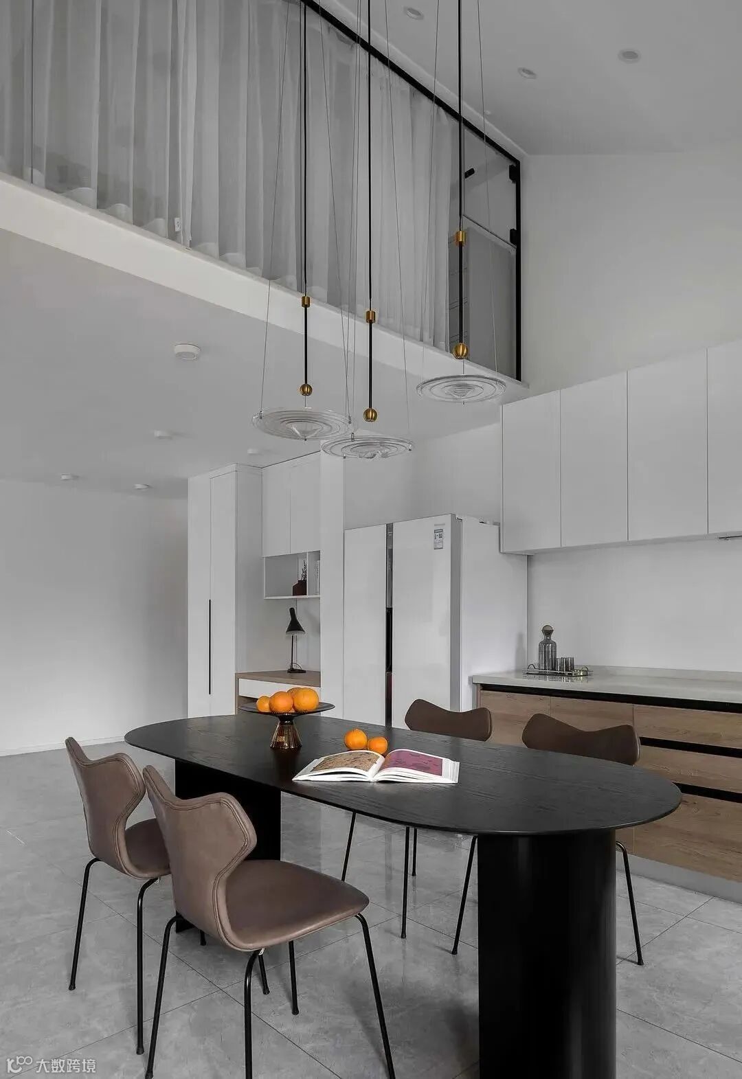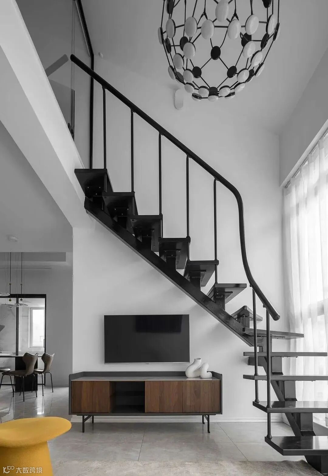 旋转半弧楼梯以全黑色为主,台阶、扶手,彰显出现代而时尚的格调,弧度从下而上,一气呵成,将规模和比例展示得恰到好处。