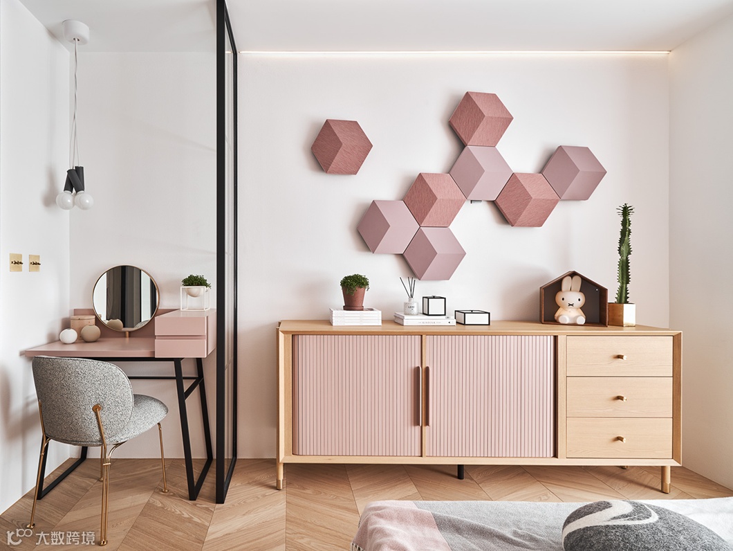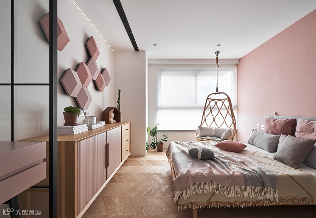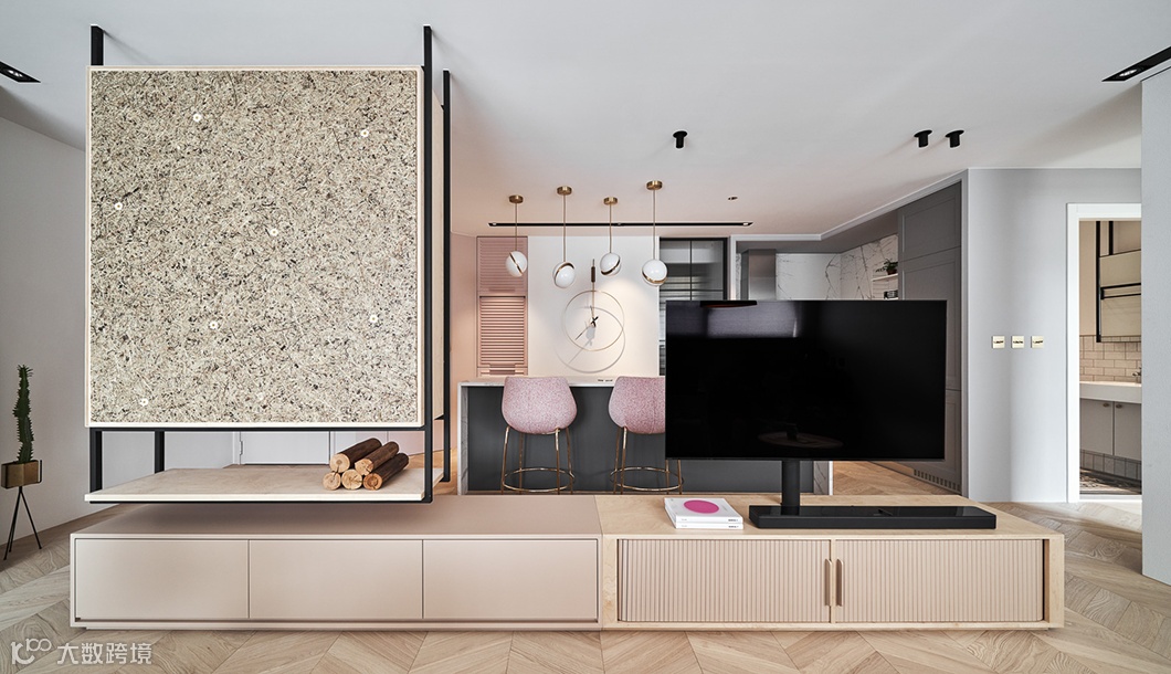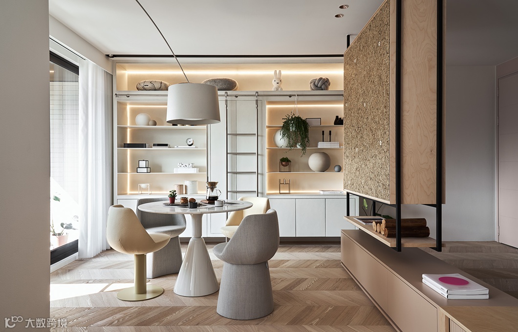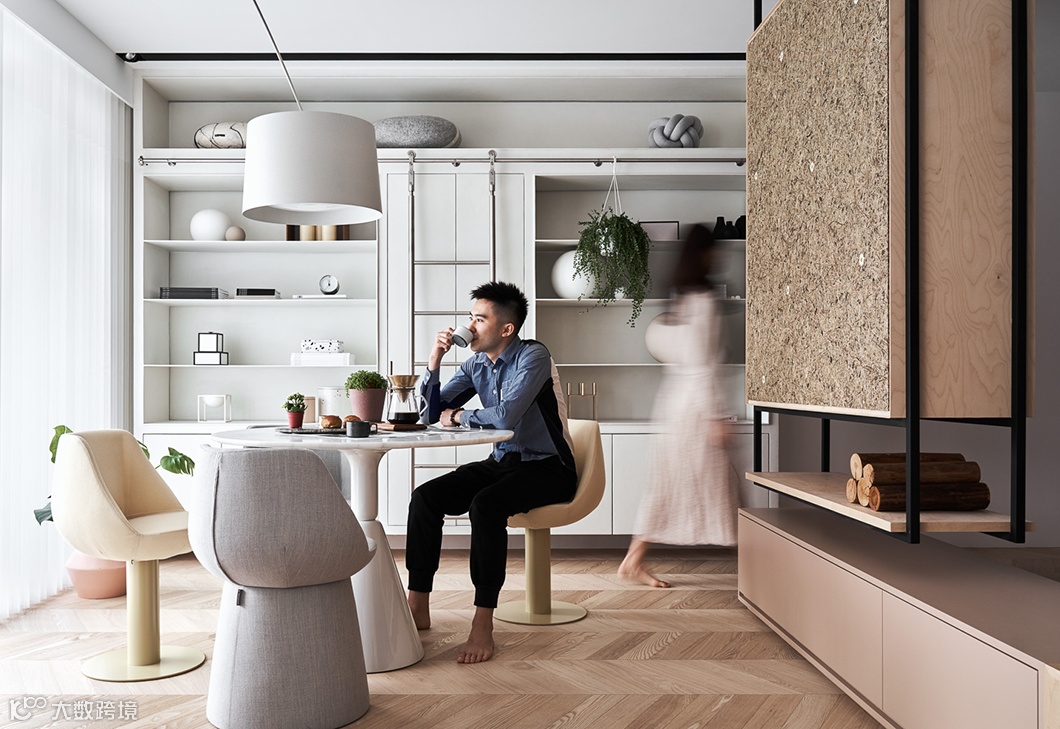 兼具隔屏功能的收纳柜则采用阿尔卑斯山花草板,让人回到家就能闻到淡淡的清香,获得满盈的疗愈感。