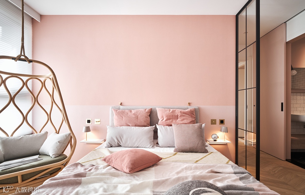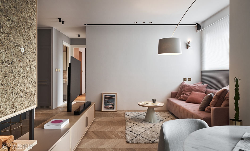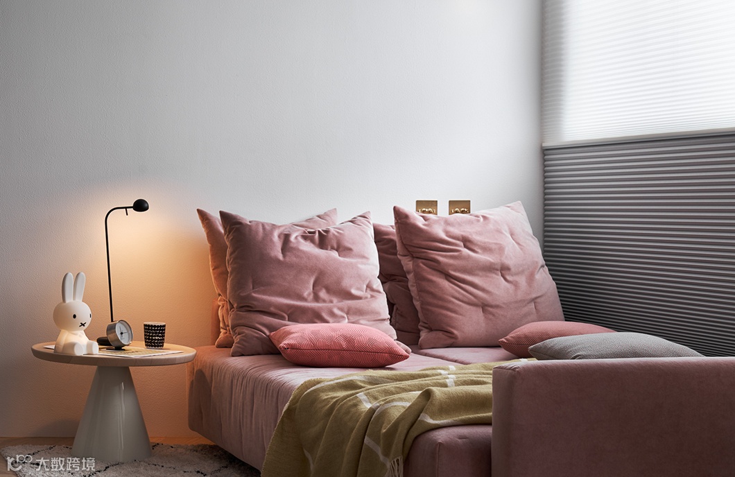 客厅采取较为随兴的家具配置,粉色系的沙发床或坐或卧都相当舒服放松,完全释放上班一整天的压力与情绪。