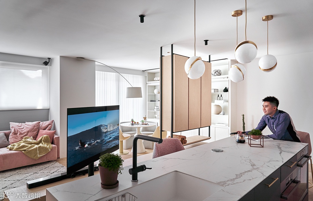 延伸的电视柜,一方面承载可转动的电视架,另一方面也划分出客餐厅与厨房的界线,同时让室内能保持光线、视线的流通,知晓彼此的动态。
