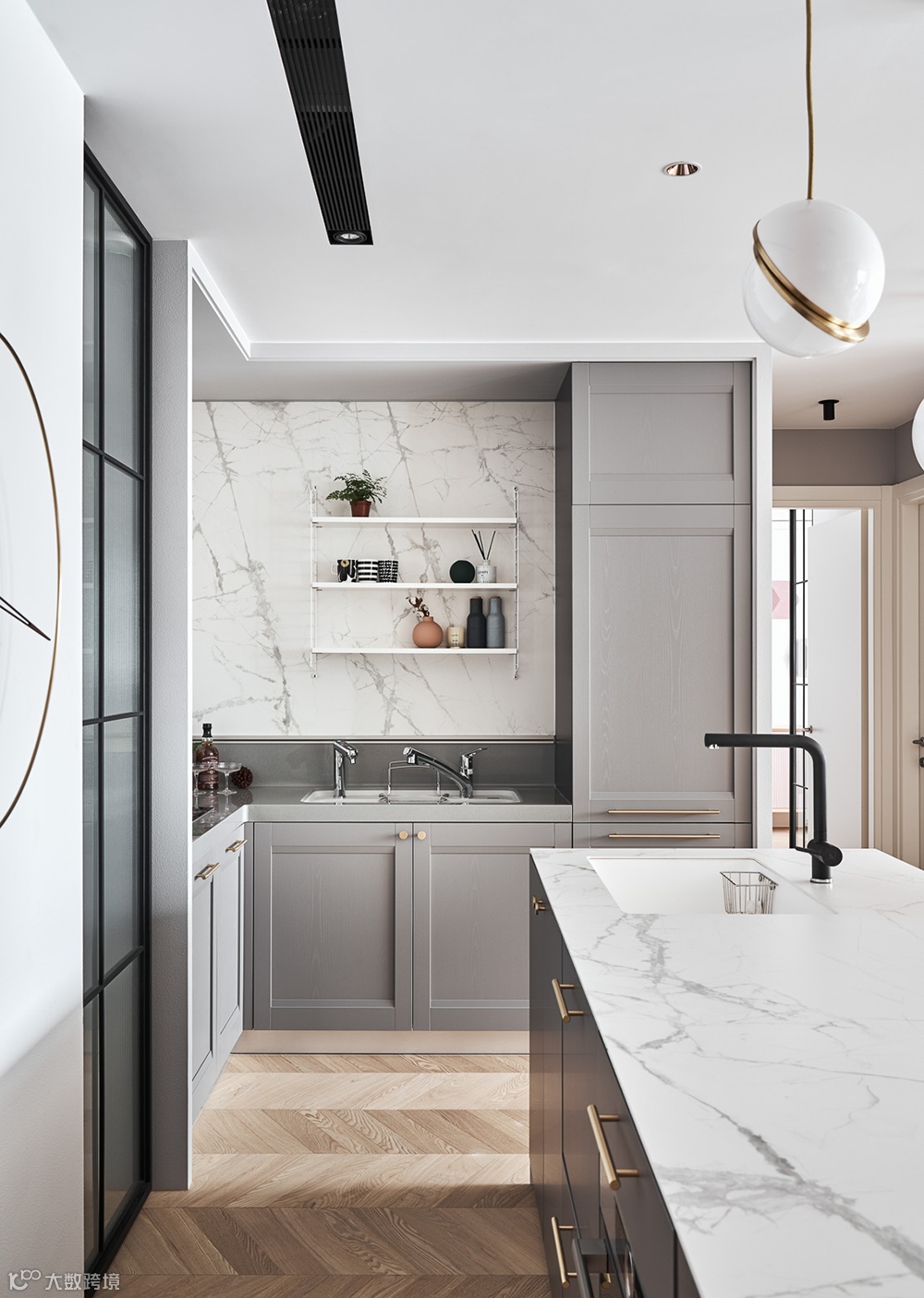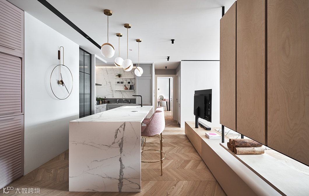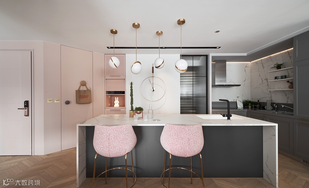 厨房选择灰色橱柜搭配粉色墙面、带金吧台椅,营造柔和轻奢的氛围,使夫妻俩可以享受舒适的午茶时光。