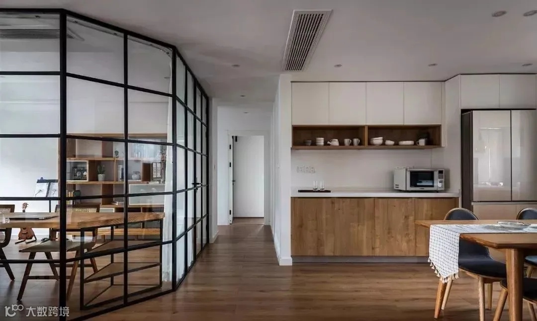 顶天立地的餐边柜,可以将冰箱等大件厨电嵌入里面,满满的高级高,也是小编个人比较推荐的做法。