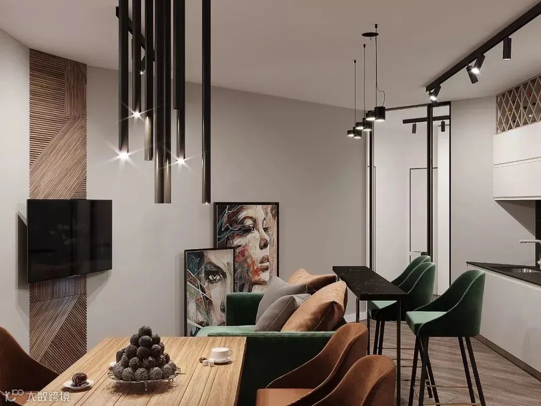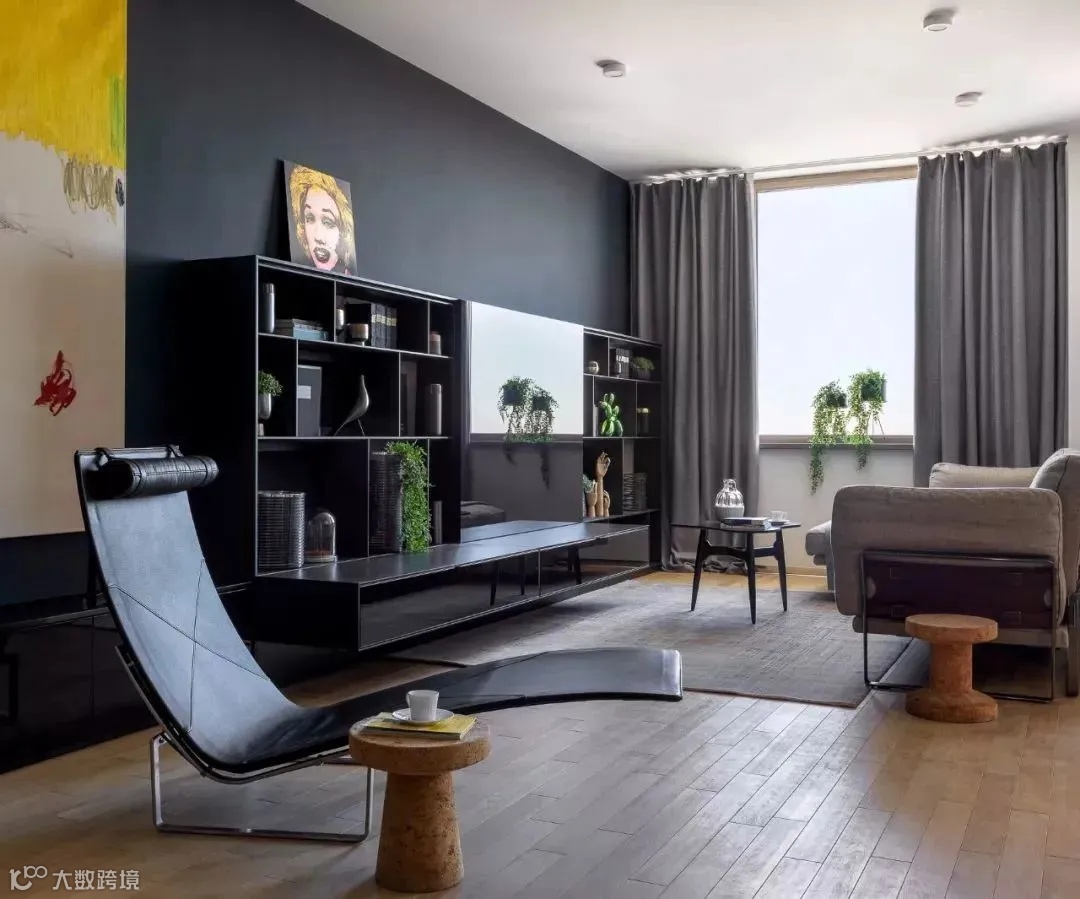除了白色与浅灰,黑白灰作为经典配色方案,把黑色或是深灰色作为墙面搭配的话,那么整体空间效果都会显得格外的稳重有档次。