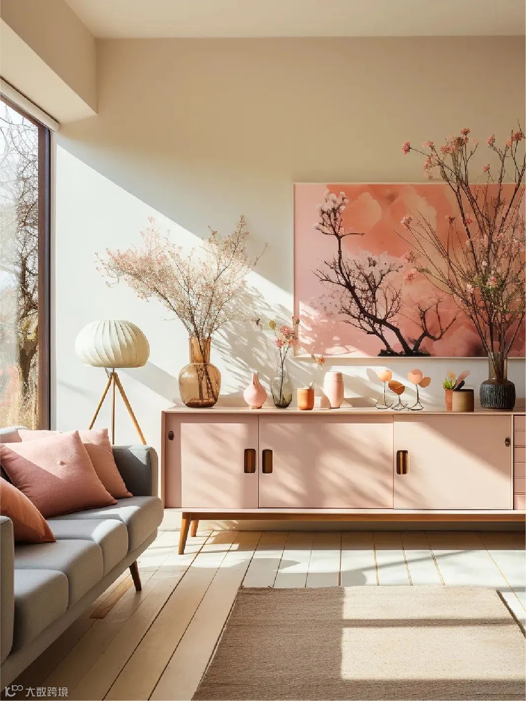 在家装设计色彩搭配中,柔和桃与米色、棕色的同色系搭配会给人一种心灵绽放的感觉,深浅不同的同色系看起来舒适、和谐,同时又富有高级的层次感,打造出简约而优雅的居家氛围,为新居注入一丝温柔与亲和力。