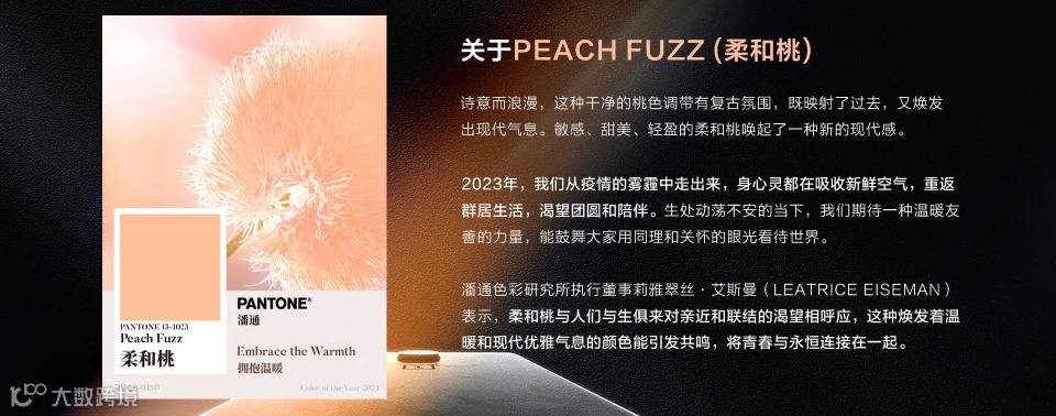 至于选择“柔和桃”的原因,由于2023年人类生活中充满了各种“动荡不安”,人们对同情和怜悯的需求与日俱增,对和平的向往有增无减。