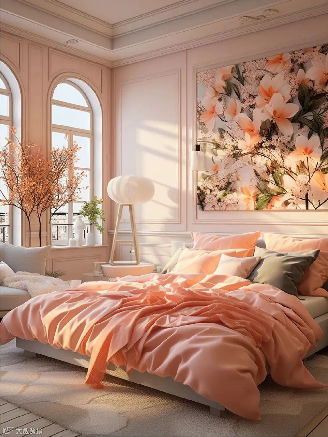 将柔和桃运用于卧室私人空间,能营造出舒适与浪漫的氛围,让人心灵尽情舒展,带来深刻的情感体验。