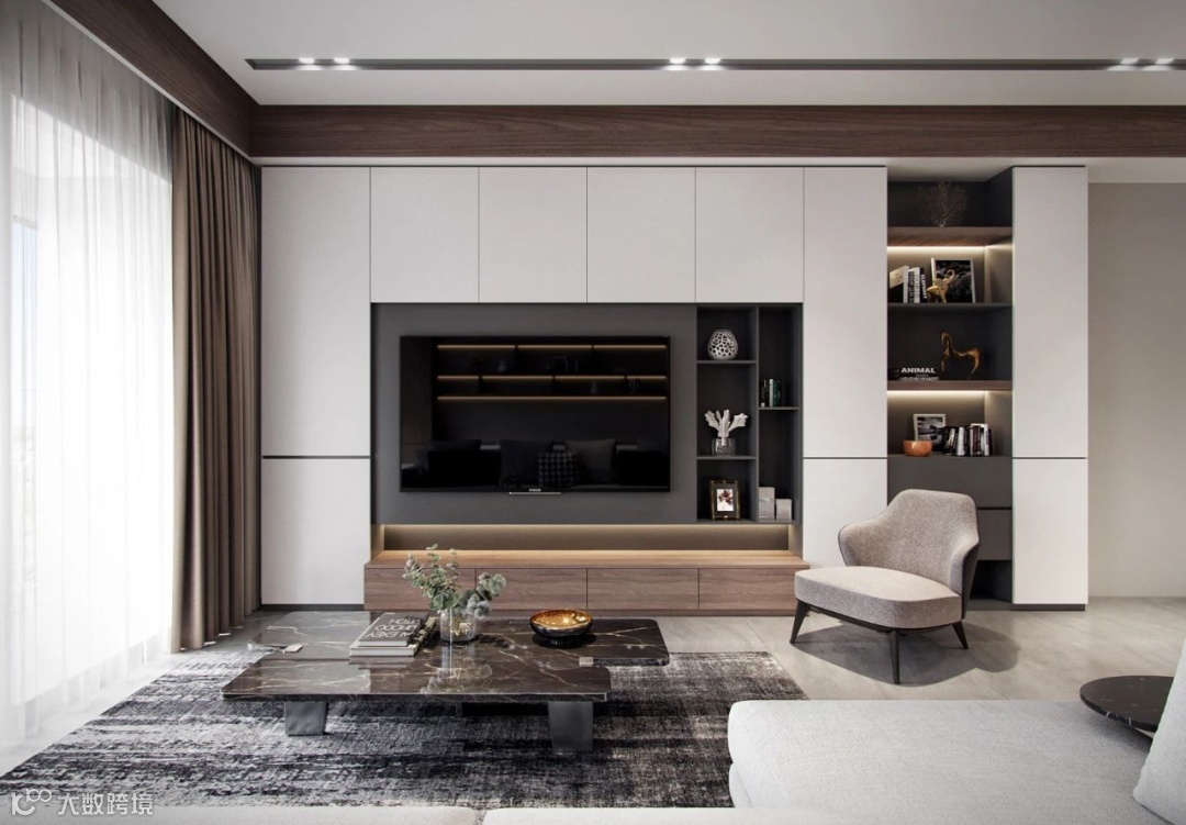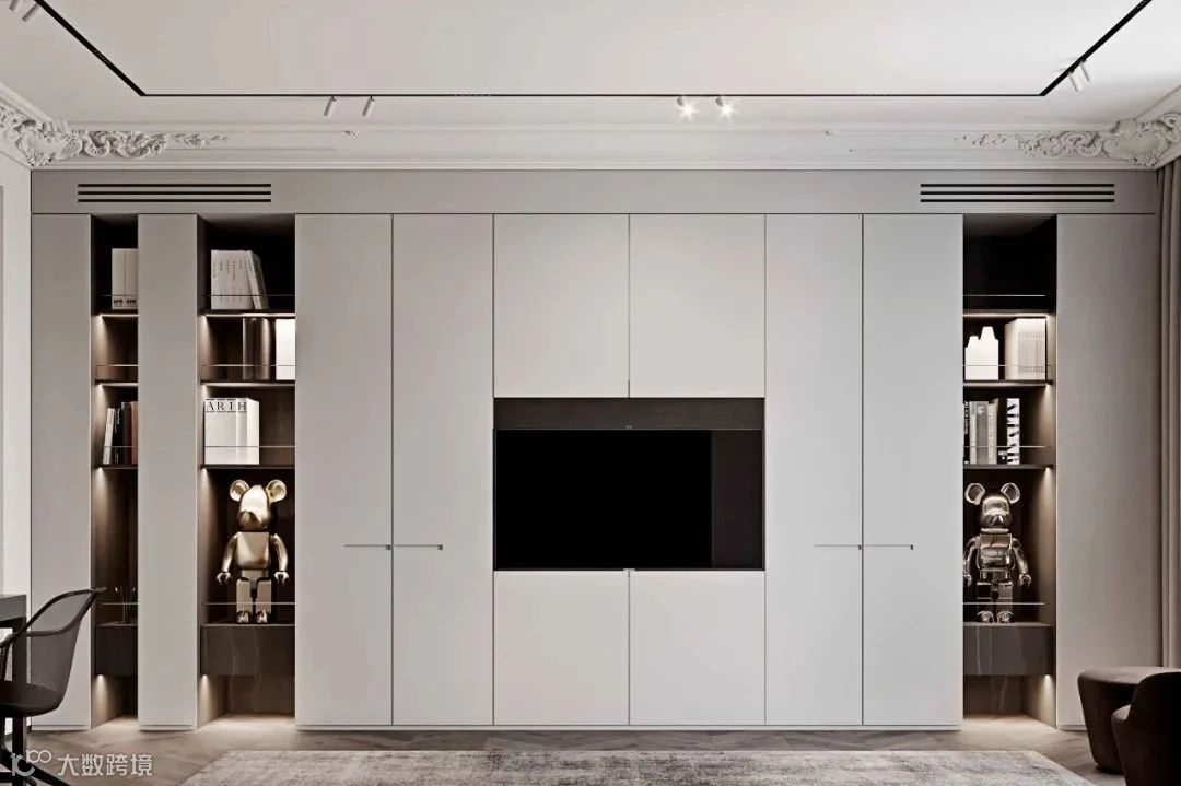 电视墙这个位置,区域较大且集中,如果做成整墙收纳,容量不可小觑。可以说,整墙收纳电视柜,应该是客厅最强收纳设计,没有之一。