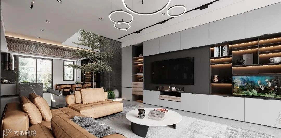 藏八露二原则应用到客厅收纳也是如此。像电视柜这种大面积的柜子,预留20%做成开放式,剩下的装上柜门就行。否则敞开太多,杂乱的物品又会直接影响客厅的整洁。