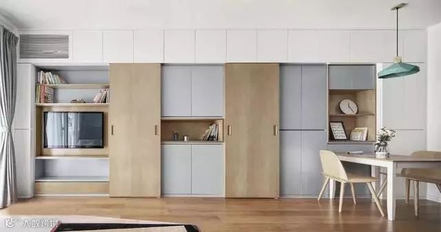 你还可以根据自己的需求灵活选择,封闭式或开放式的柜门,避免视觉杂乱,或者干脆将电视隐藏起来,需要的时候打开移门,就能为整个客厅颜值加分不少哦~