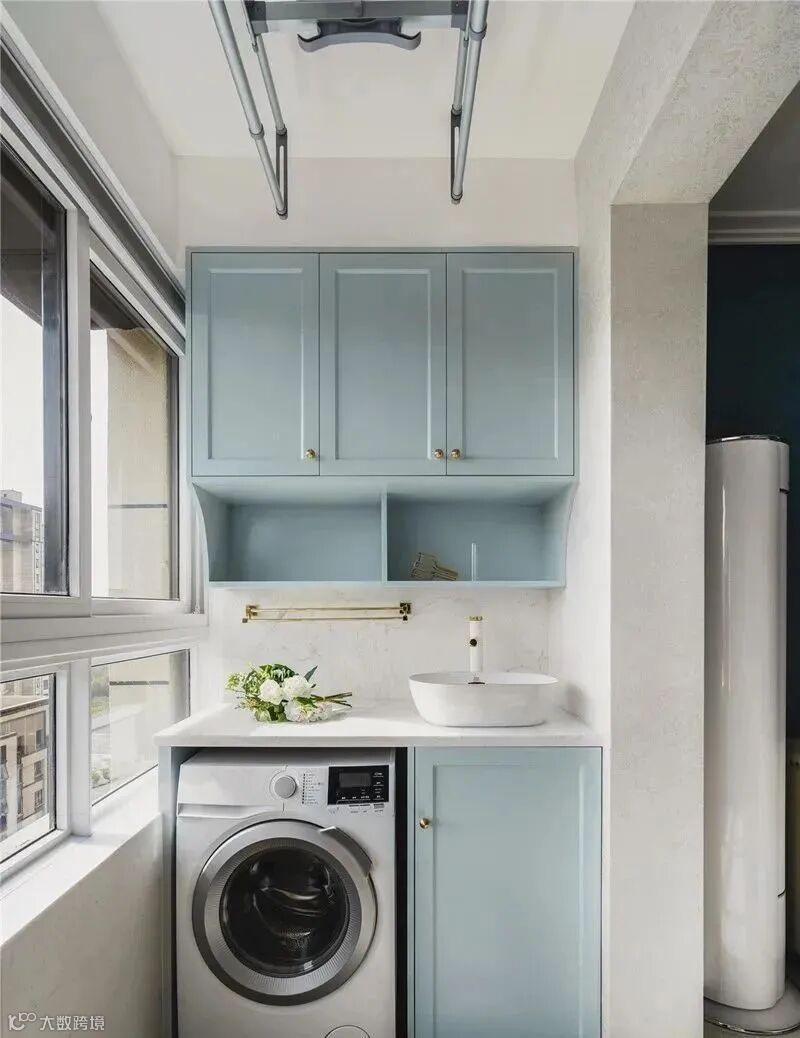 PS:但凡阳台放洗衣机,一定要处理好防水、排水以及防晒问题,尽可能避免选白色柜门,以免黄变。