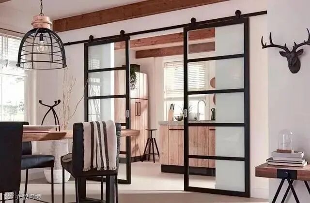 谷仓玻璃推拉门也很适合用在厨房门上,因为它可以一推拉移动到两边墙上,这样一打开谷仓门,一点都不影响厨房和其他空间的通透感。