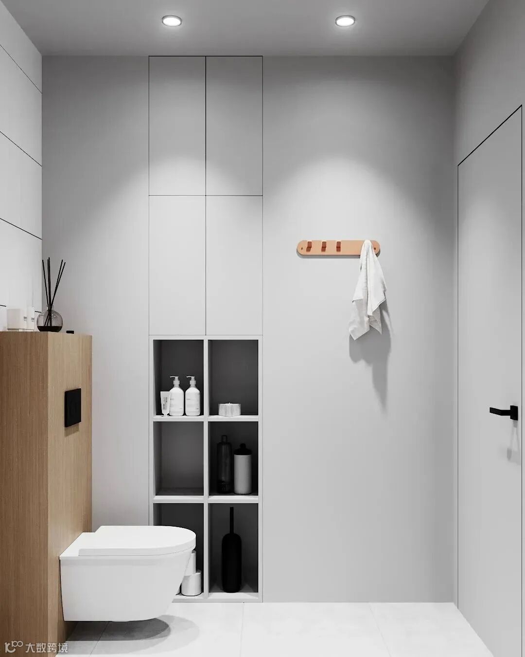 可以在卫生间的墙壁上安装些隔板搭配上五金配件,比如在马桶的上方安装些层板,收纳些卫生用品,五金配件可以挂些擦手巾或者毛巾类的物品。