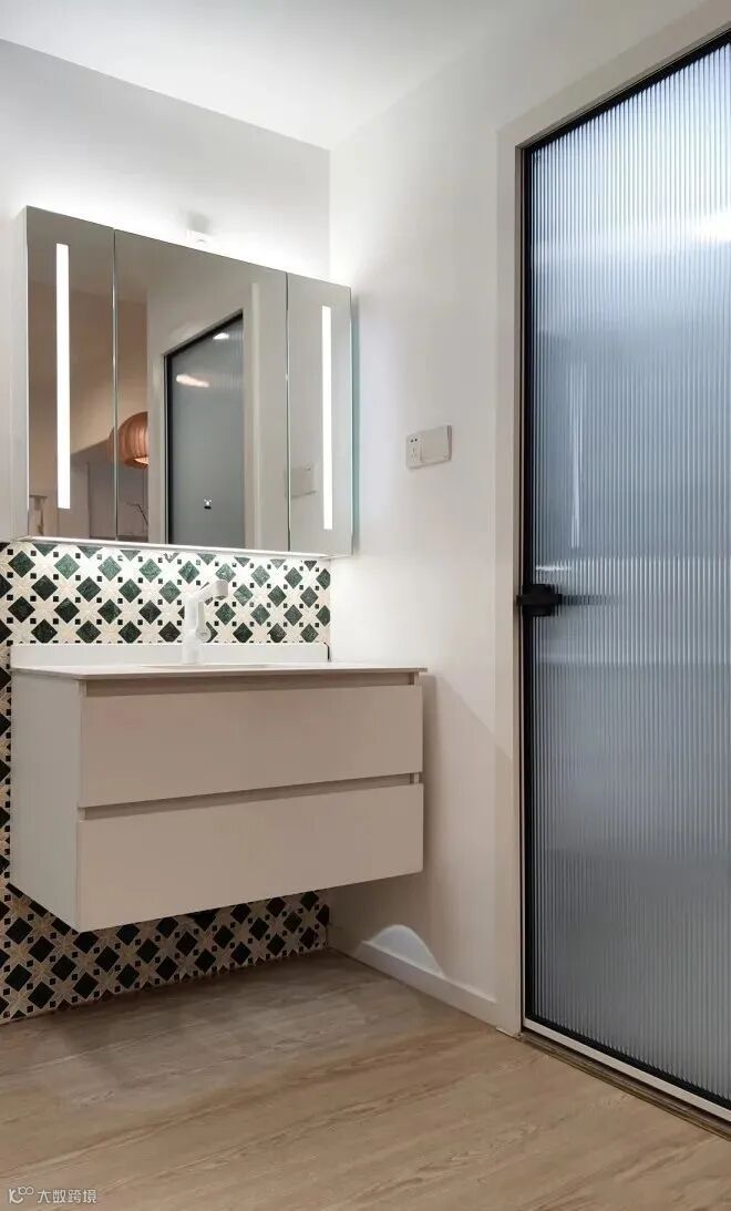 单独一面镜子显然是不实用的,况且还占据了一面墙的空间,小编建议可以做个半开放式或者封闭式的镜柜,将经常用的洗漱用品放在开放区域中,不经常用的摆放在柜体中,镜柜干净透亮的视觉效果可以放大空间,同时也解决了收纳的需求,台面不再凌乱。