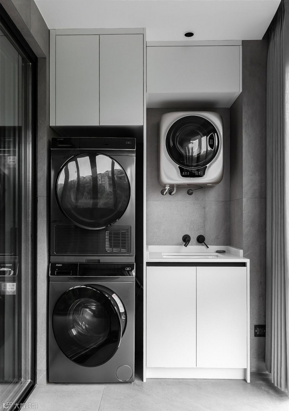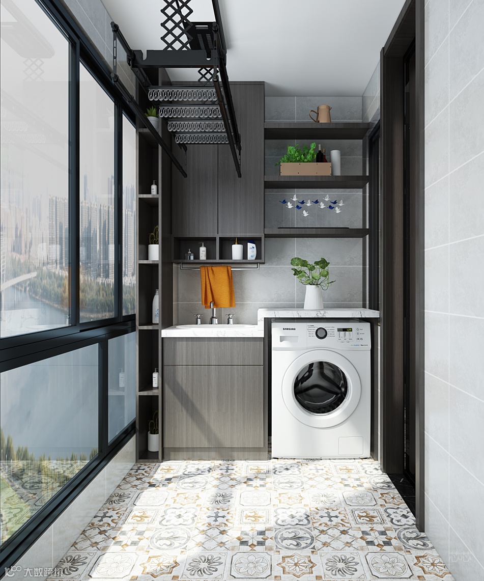 洗衣机放浴室怕受潮,放厨房又占地方,通过定制置物架,把阳台的部分空间做成洗衣房,不失为一个不错的选择。阳台相较于卫生间来说空间相对更大,洗衣、晾衣、烫衣,都可在阳台上完成,除了洗衣外,还可以设计收纳柜等等。