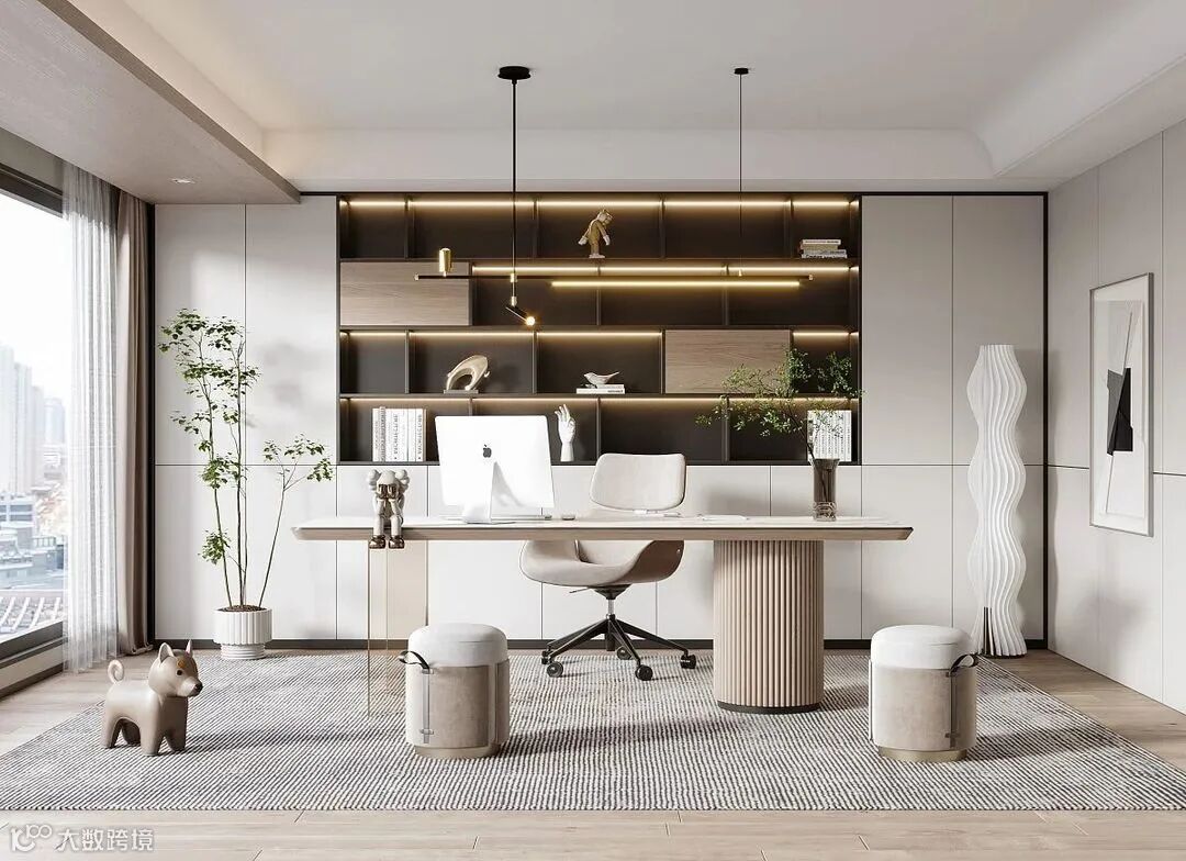 下面是开放式柜格,可以放置一些装饰摆件、相框、手办,起到增加书房趣味性的作用。也可以摆放平时常用的书本,不用起身方便拿取。桌面下方定制推拉抽屉,收纳能力max,桌面也能常保整洁。