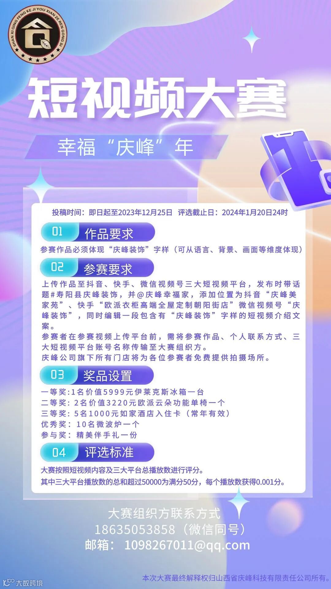 参赛作品必须体现“庆峰装饰”字样(可从语言、背景、画面等维度体现),表达方式多种多样。