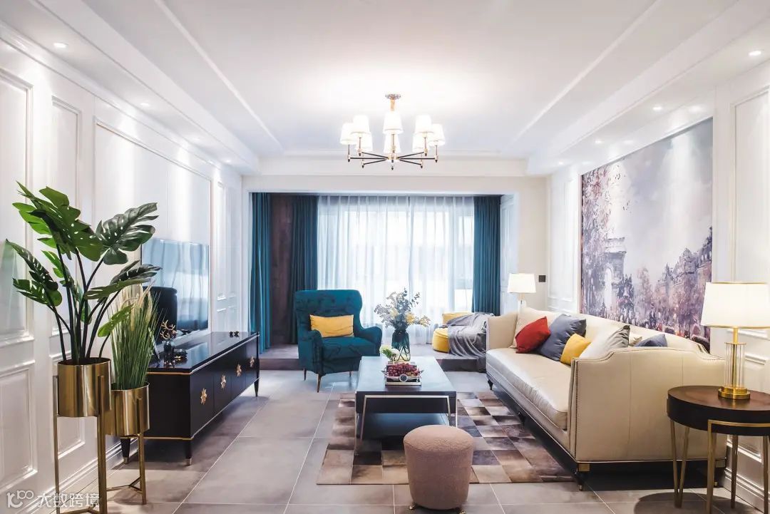 ⑥灯具:客厅灯具一般以吊灯、射灯、台灯为主,吊灯在客厅中更多起装饰作用,配合装修风格。层高较低或想追求简约风的家庭更流行选择无主灯设计。