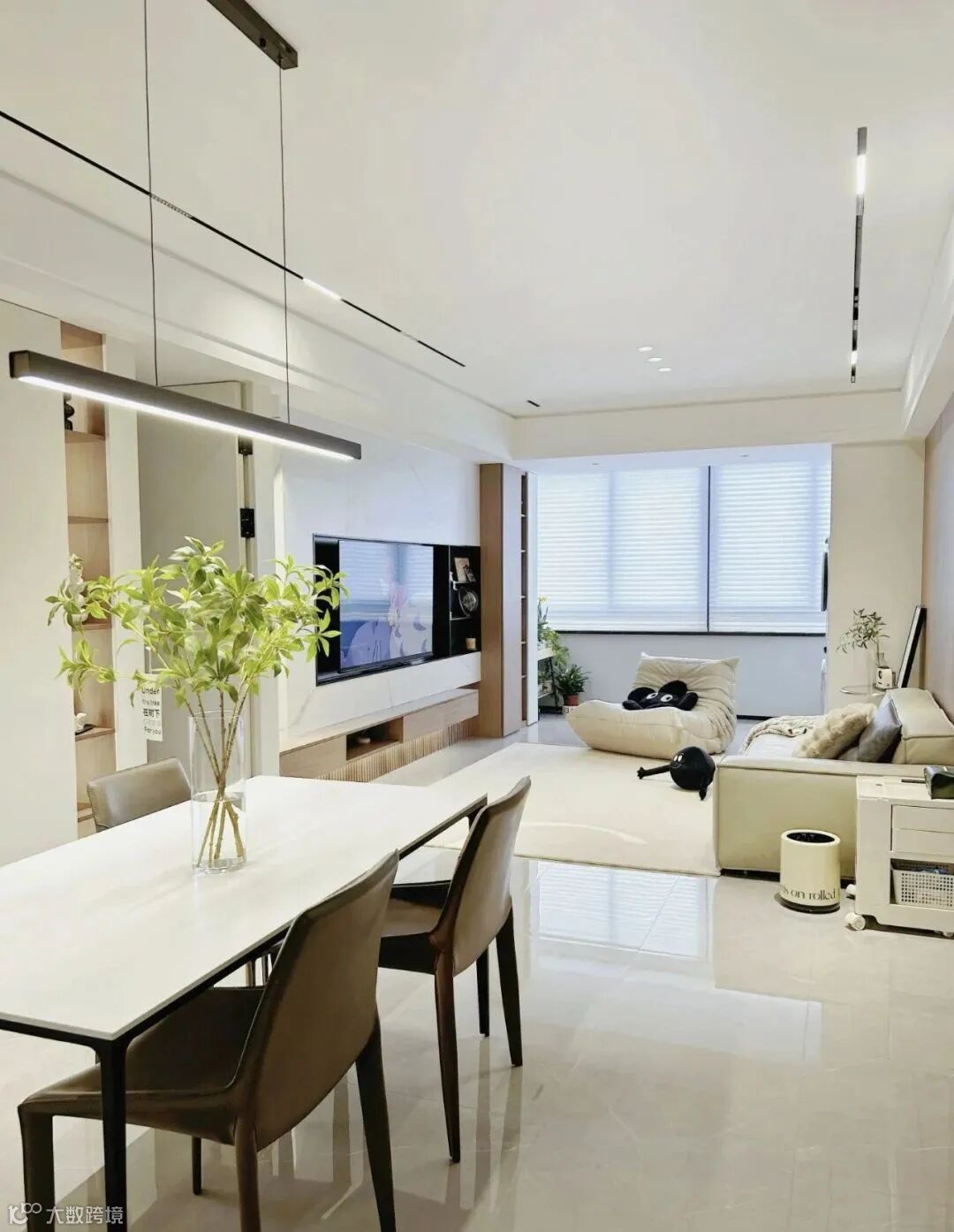 打掉阳台和客厅原本的移门,封阳台,最后阳台、客厅、餐厅组成一体,整体显大且通透。