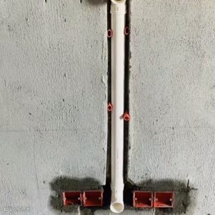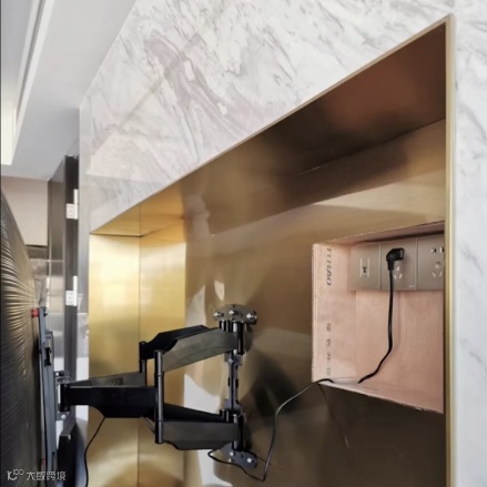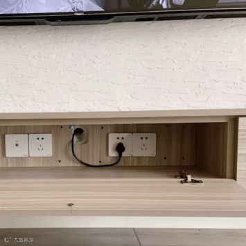 再比如电视的插座以及电源线,有两种方式隐藏它们,一种直接把它们放在电视后面,但要注意避开中心位置的悬挂区域,另一种可以把插座放在电视柜里,用一根50管连接到电视后面,这样也方便连接其他设备。