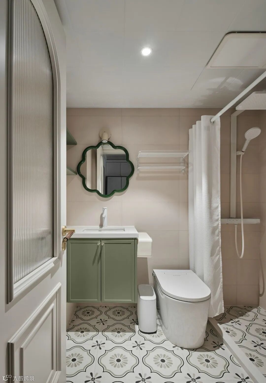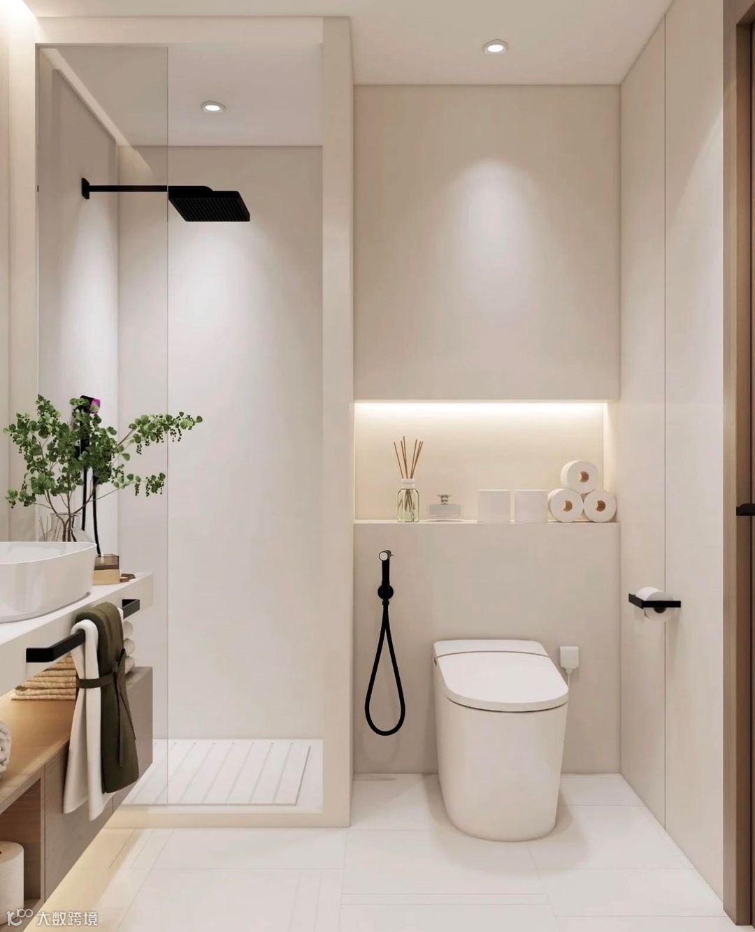 可以在卫生间安装面积较大的浴室镜,通过镜子的反射效果,使整体空间更加通透明亮,从而形成空间较大的视觉感。