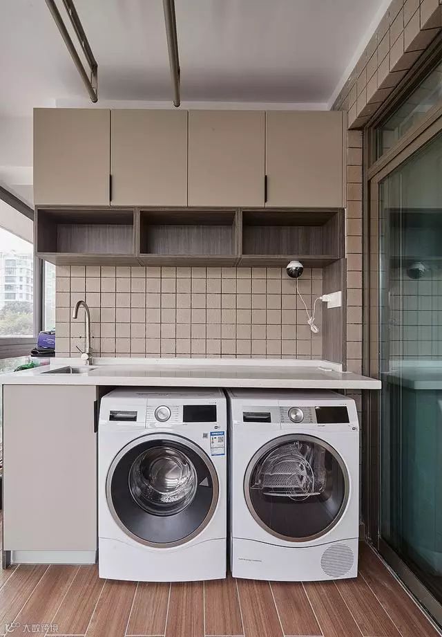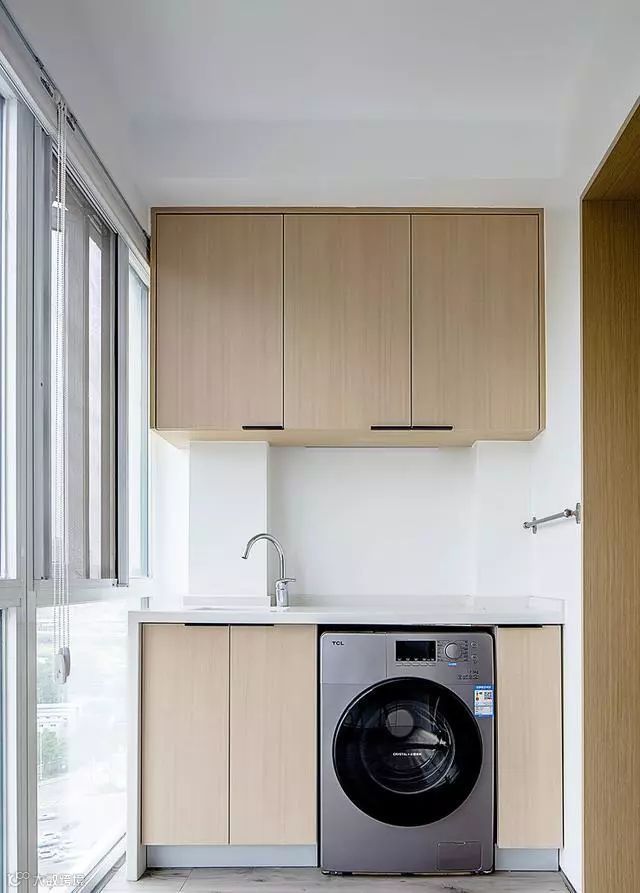 在阳台上定制一个阳台柜,可以把洗衣机嵌入进去里面,显得更加整齐,只要提前确定好洗衣机的尺寸,就可以量尺定制了。