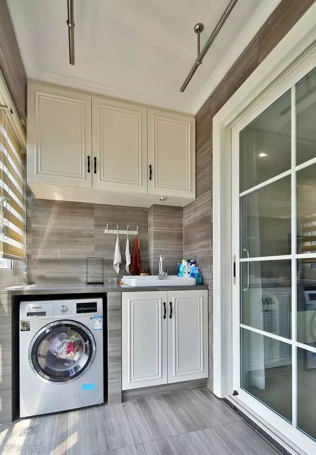 4、 阳台柜最好到顶设计,把上方的空间都充分利用起来,还可以根据需求来设计,比如你家想要摆放一台洗衣机和一台干衣机的话,还可以预留位置,把两台机器叠加起来。