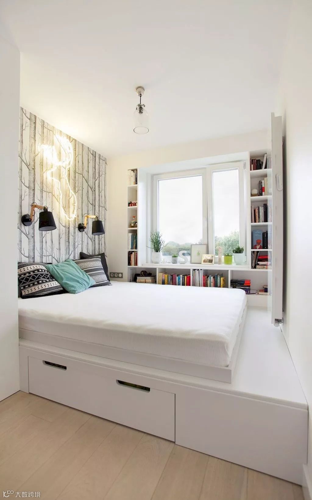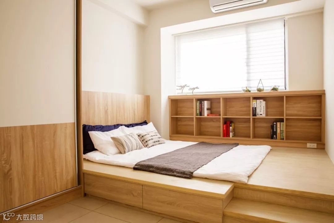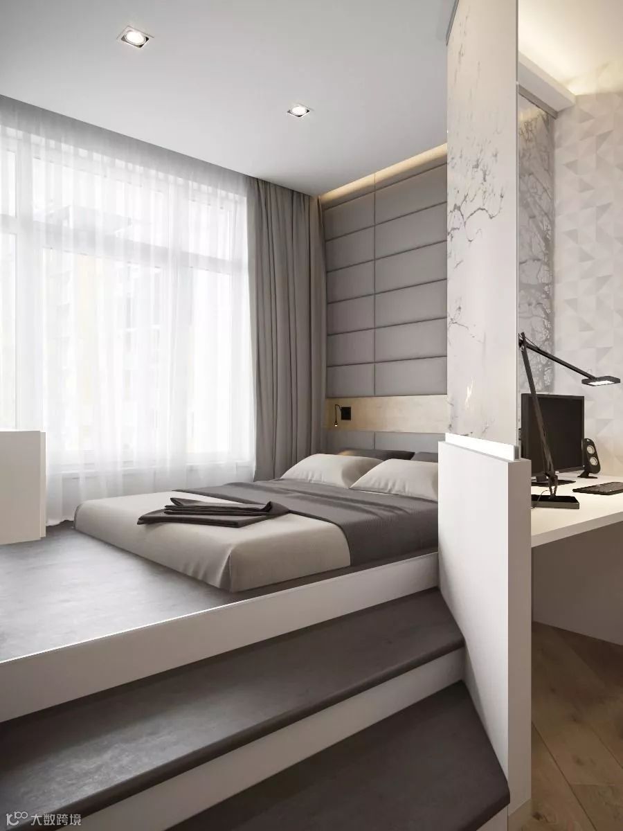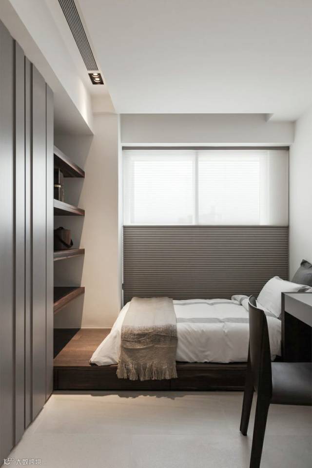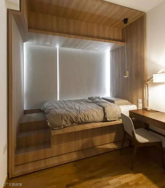 在卧室中设计榻榻米,能给人带来一种轻松、休闲的生活氛围。增高的地台与大体量的床融为一体,不仅做到“小空间大利用”,还能提供更多的收纳功能。