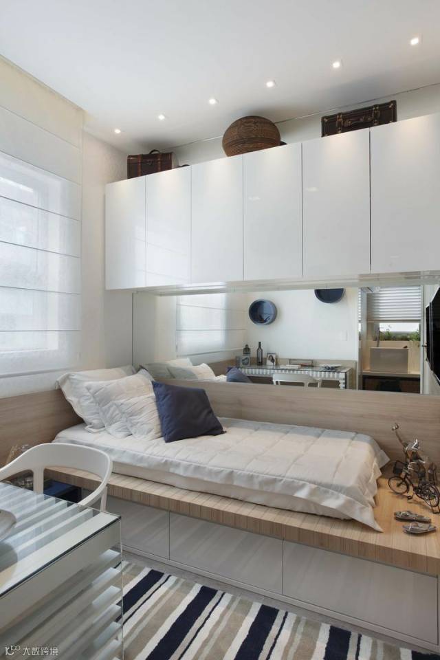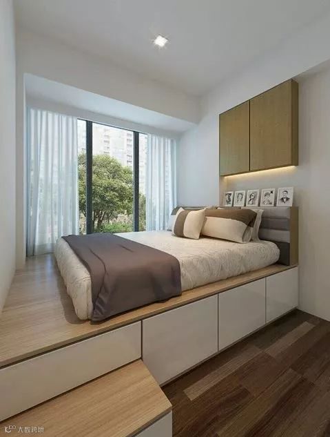 有些卧室因为户型条件的限制,放置了一张床后,其余活动空间就会变得十分拘束,采用定制的榻榻米来掩盖不足,能使空间格局更为完整和美观,无形中将实用性与欣赏性融为一体。