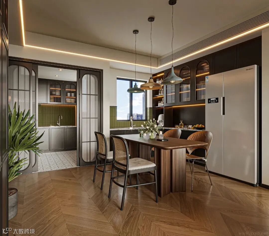 主要在桌椅、柜体、隔断上体现,还融入了欧式追求金属质地的灯具、装饰、家具配件的审美,精致又复古。
