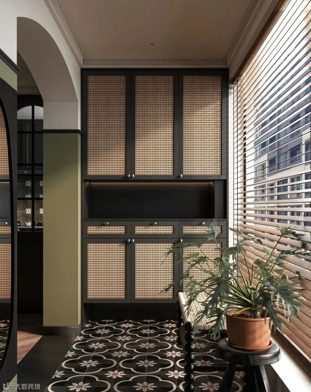 南洋复古风硬装上的元素要点有:曲线、花砖、百叶窗、老式木门、玻璃门洞等。