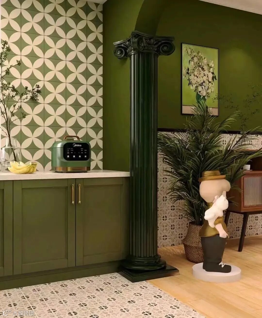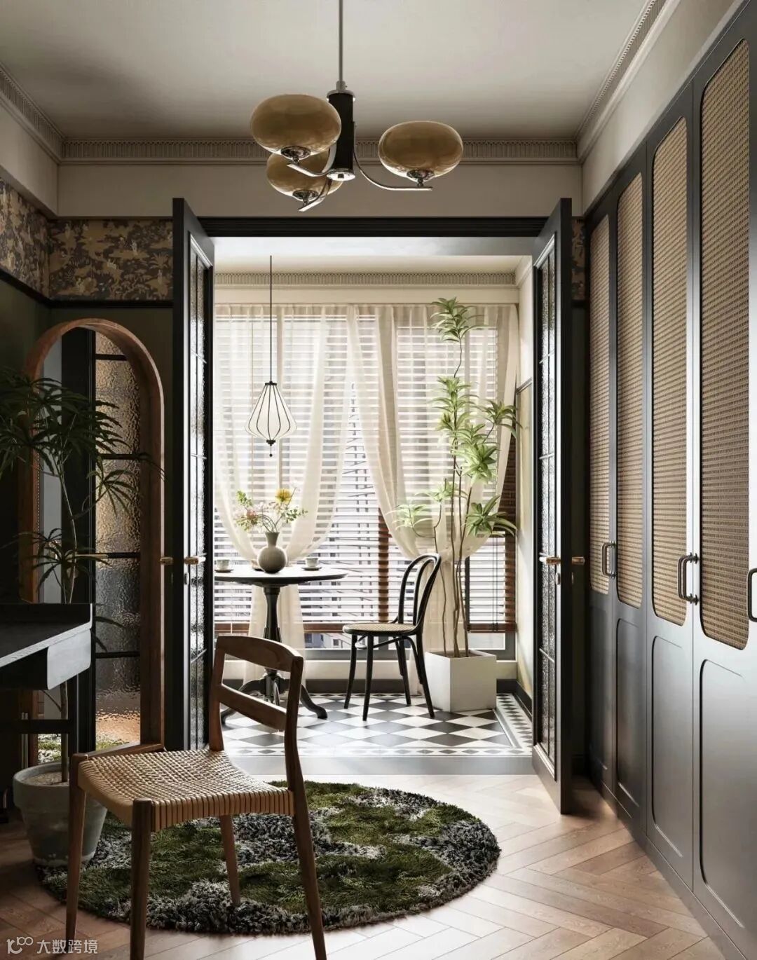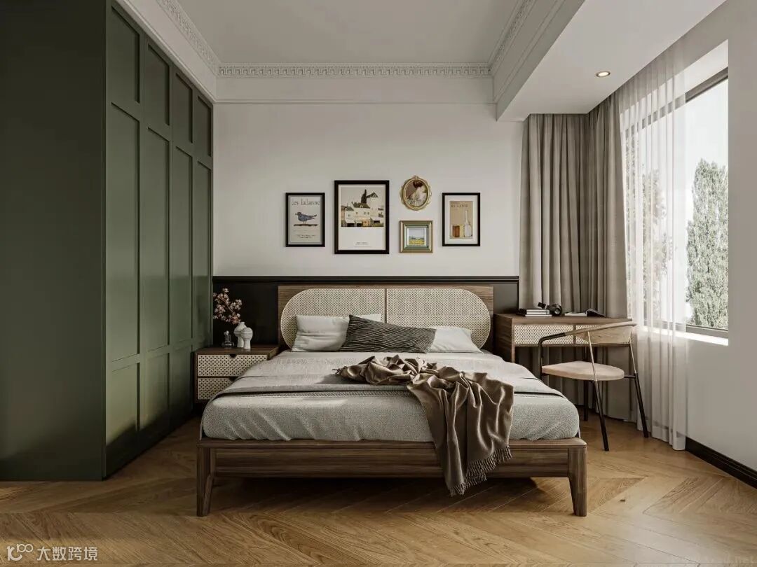 南洋复古风的色调非常统一,大部分只用黑白绿棕做搭配,复古感十分强烈,而且低饱和的绿色往往是空间的主角,不张扬中带点欲,看上去旧旧的好似怀旧电影般的滤镜。