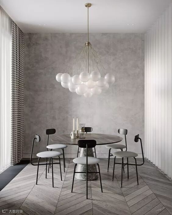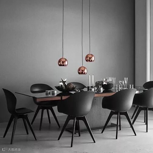 灰色调的餐桌椅,不同以往的黑色白色。不同的深度打造出不同的气息组成完美的协奏曲,将这种高级的色调运用到餐厅里,瞬间表达出了餐厅的灵动。