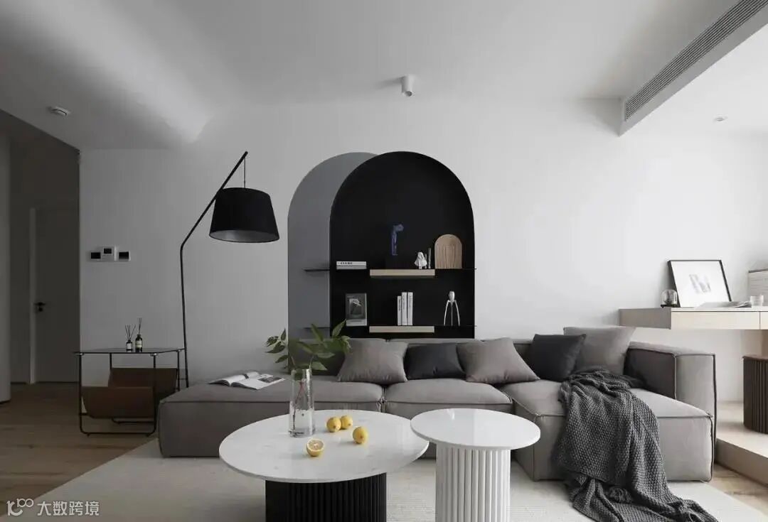 砌半墙(背靠矮柜)作沙发背景墙,还可以结合书桌或吧台的形式,提高空间的利用率。