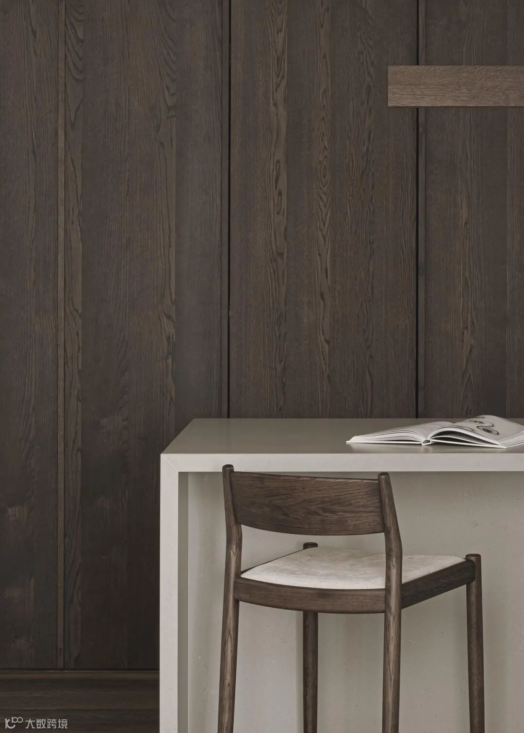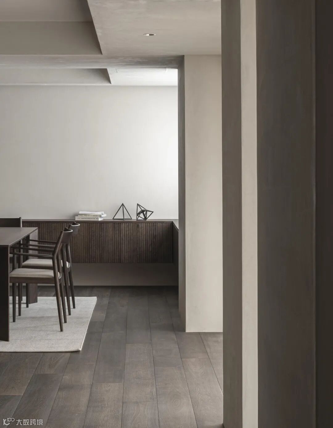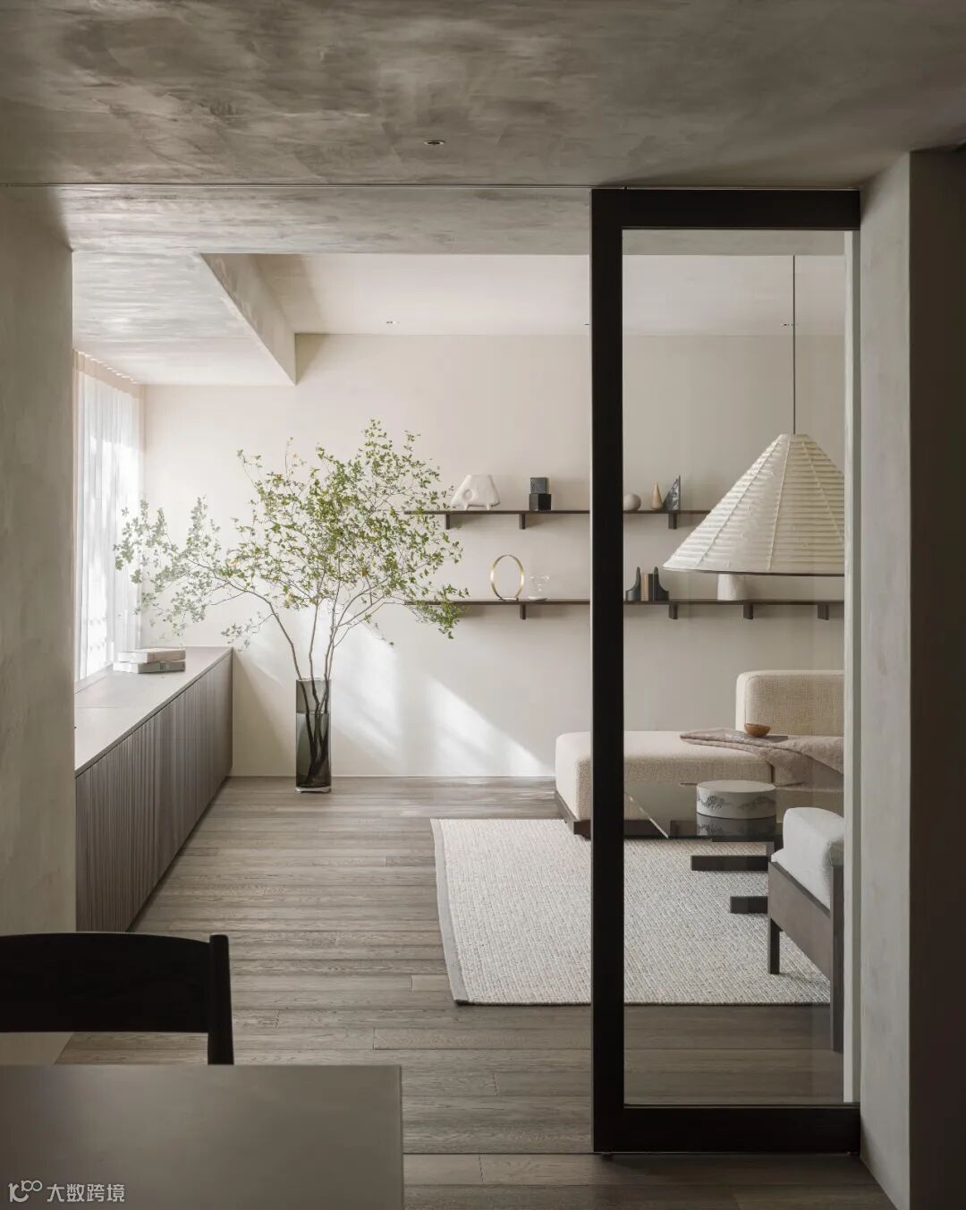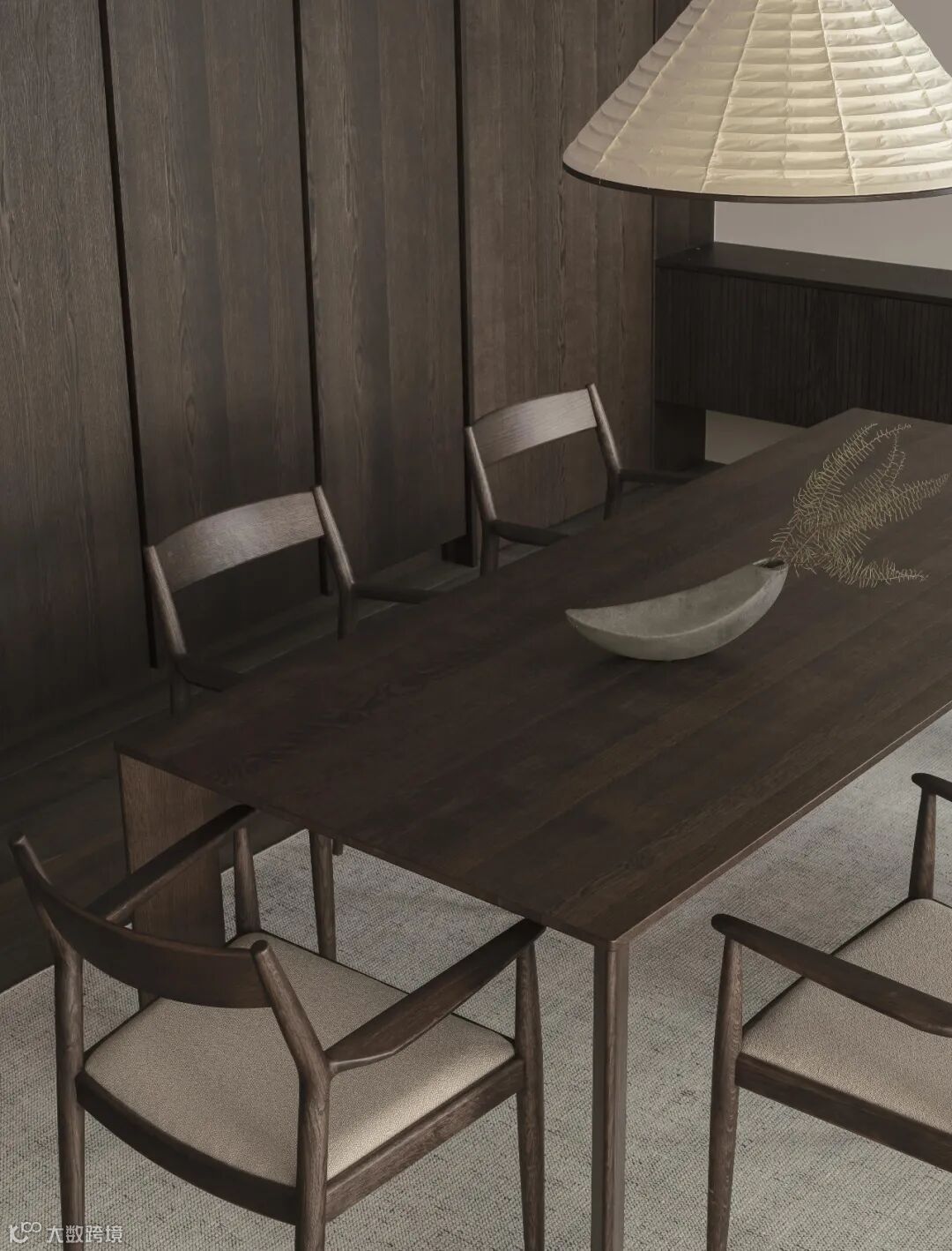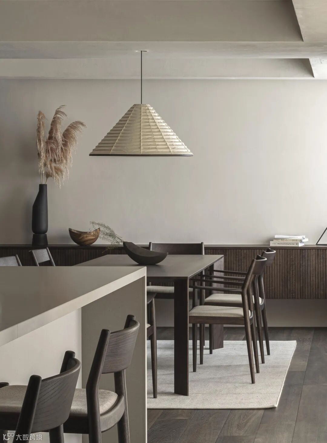 餐厅空间多使用石材、深色木材和织物。生活区带有酒柜壁龛、开放式厨房、华丽的地毯和舒适的家具,色彩的搭配和材质的运用都营造了日式侘寂之美。