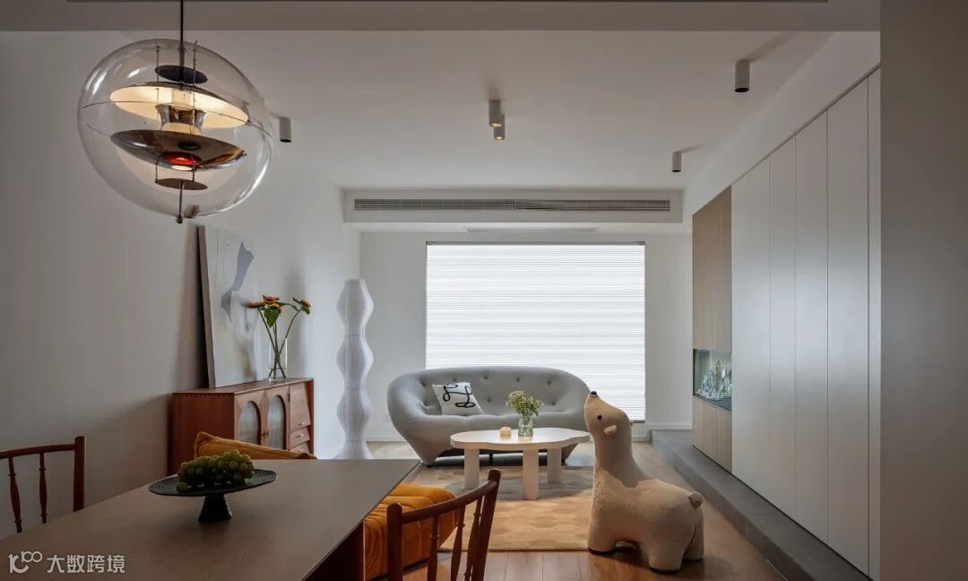 客厅选择极简、自由灵活的陈设方式,以开阔的视觉、舒适的尺度打造轻松明快、可变化的室内氛围。一整面收纳柜满足日常生活所需,强化功能外,其余均摒弃繁杂元素。