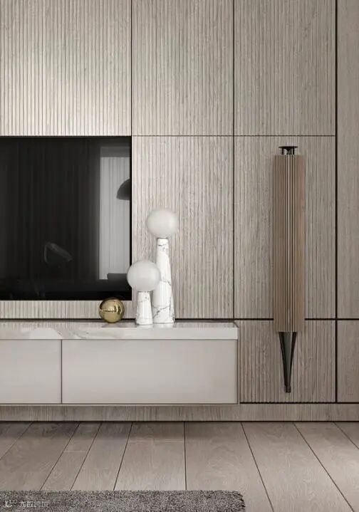 经常打扫卫生的都知道,电视是非常容易积灰的,所以与之将它挂在墙上或放在电视柜上落灰,还不如直接做嵌入式设计,边角不留缝,再也不用天天打扫啦!
