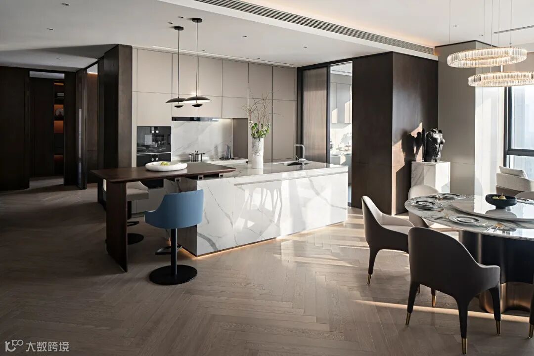 "软隔断"则不会影响空间的大小,只需要通过空间高低的不同、灯光不同、家具不同或者使用的材料不同来进行分区即可。