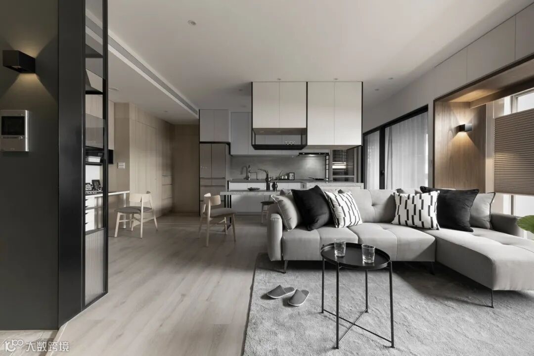 ▲厨房开放布局做LDK,沙发背后用吧台+餐桌隔断,甚至是把吧台当餐桌使用都可以。