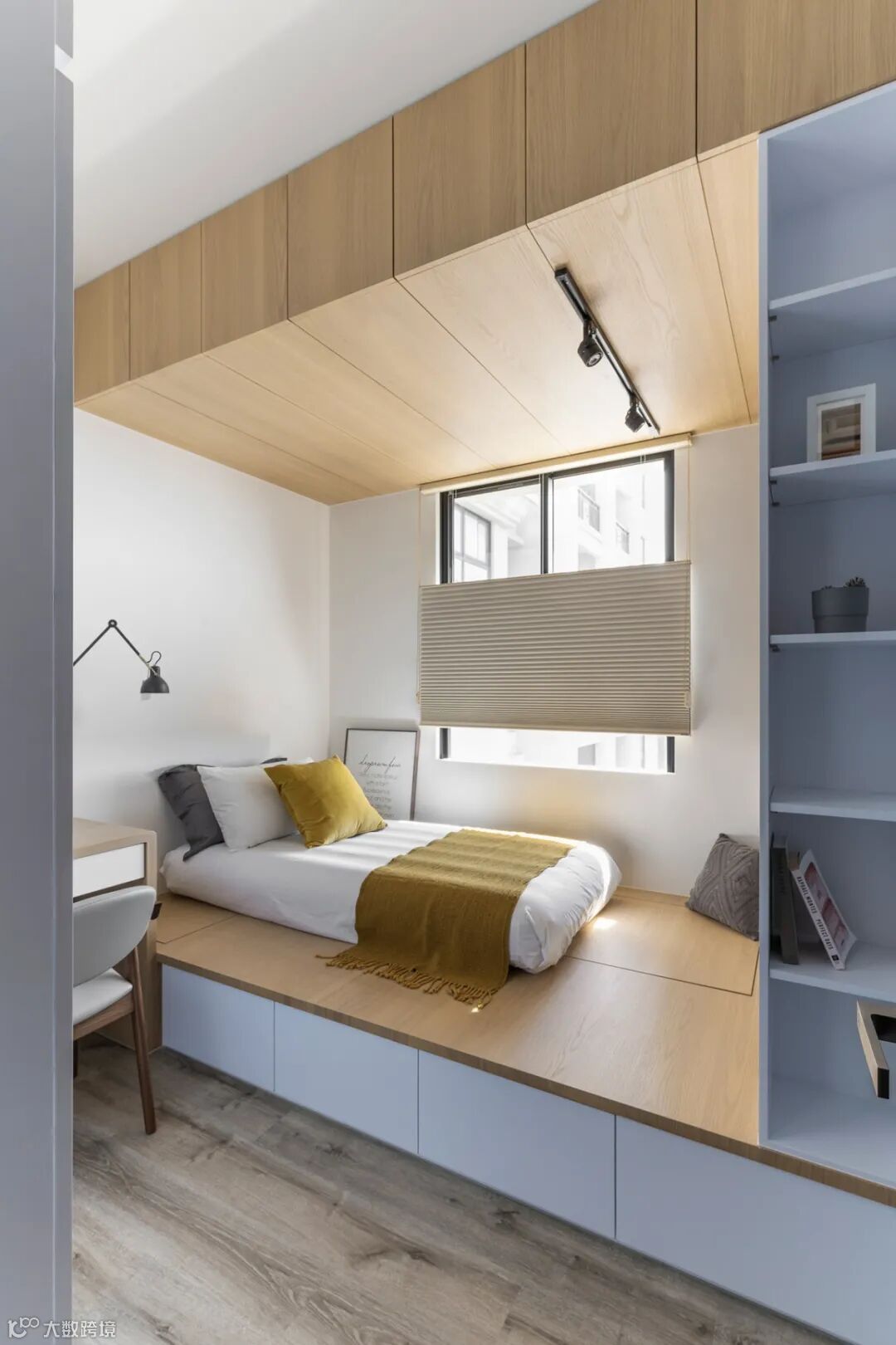 ▲用玻璃隔出睡眠+工作的小空间,做收纳+书桌+榻榻米床一体设计,满足储物+客卧需求。