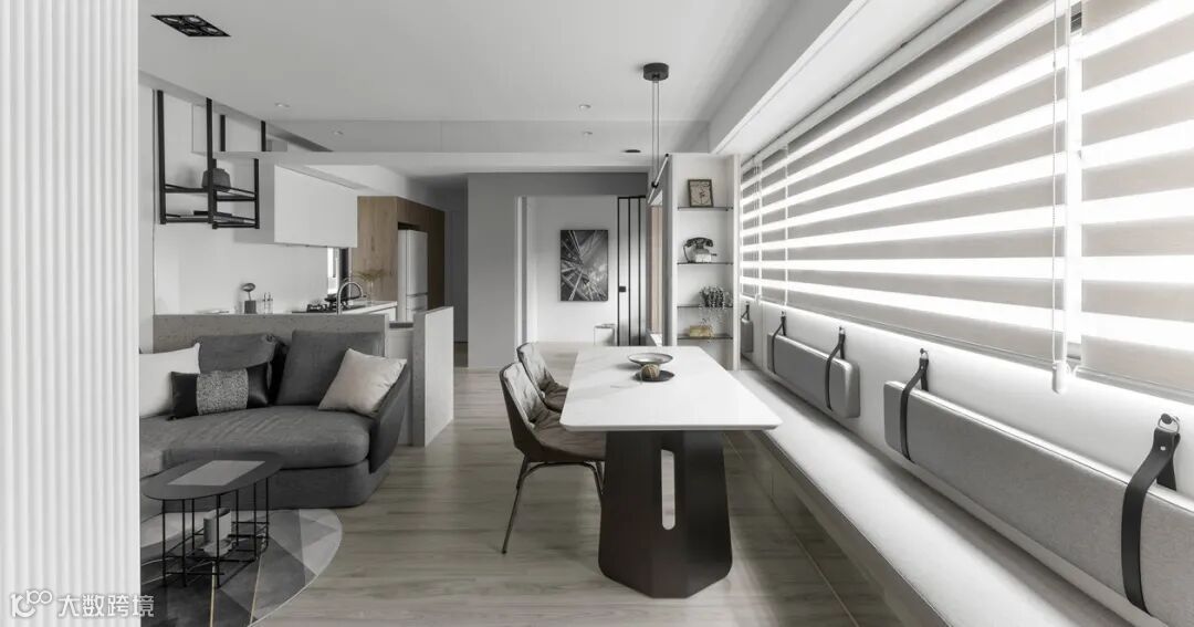 ①靠餐厅,沙发充当功能分区隔断;