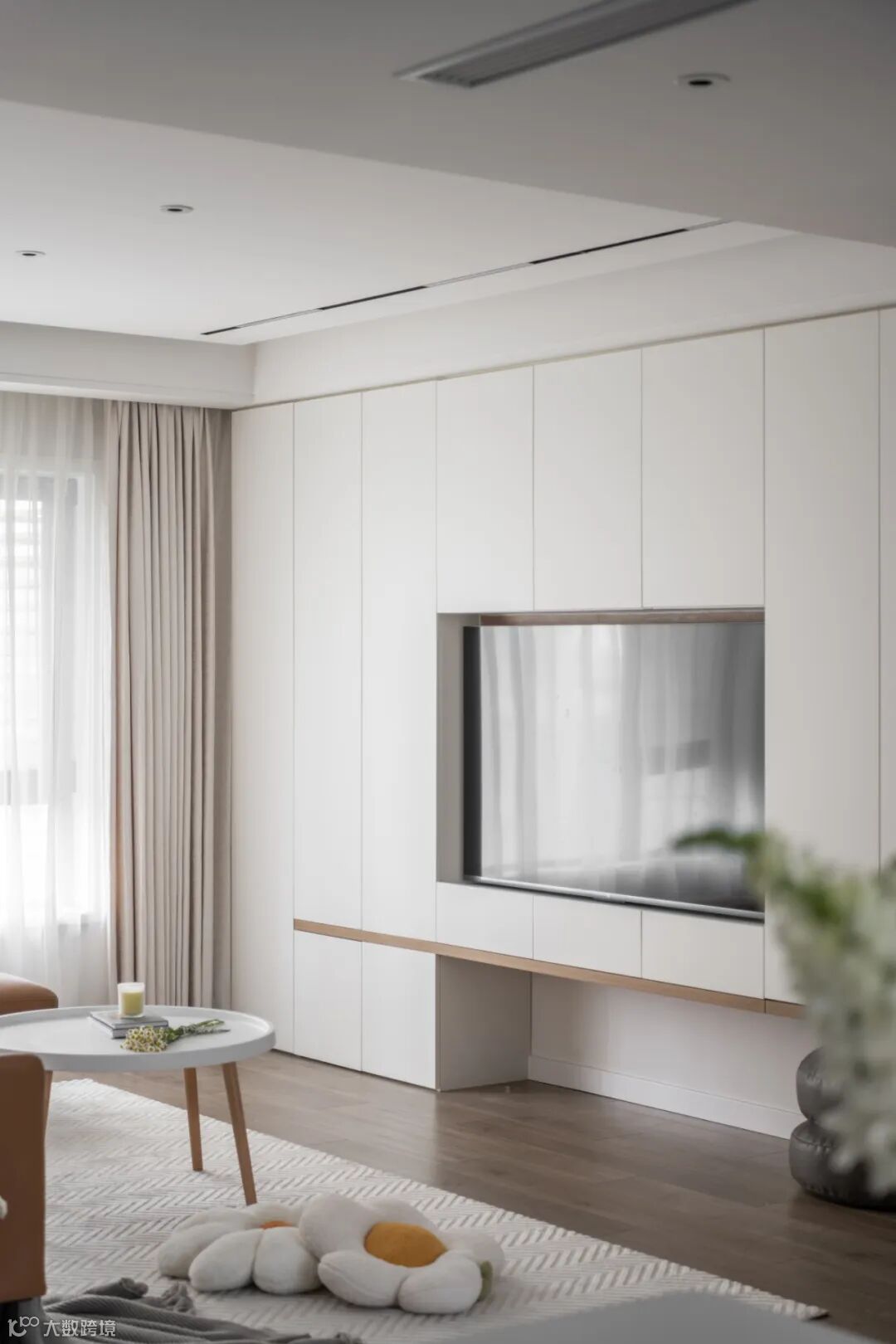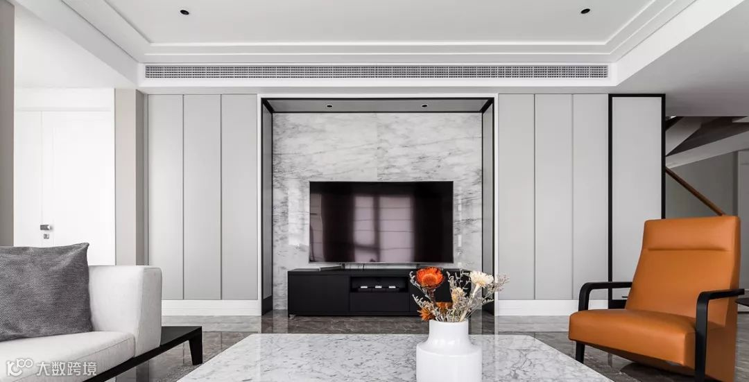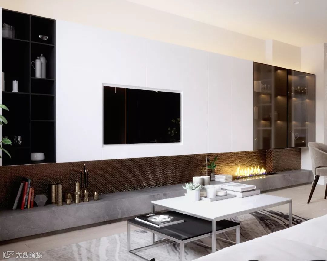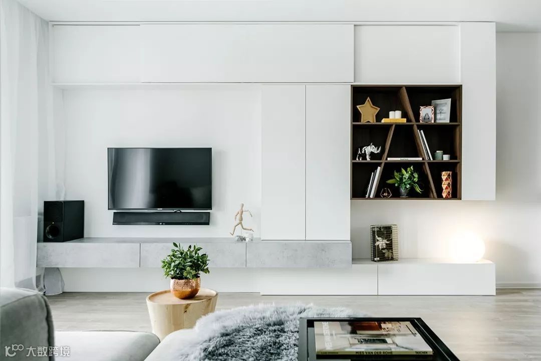 客厅里的遥控器、小家电、玩具、书籍等各类杂物,如果没有收纳好,整个空间就会显得凌乱。那不妨把背景墙充分利用起来,做个满墙的电视柜,不仅大气美观,还能增加充分的收纳空间。