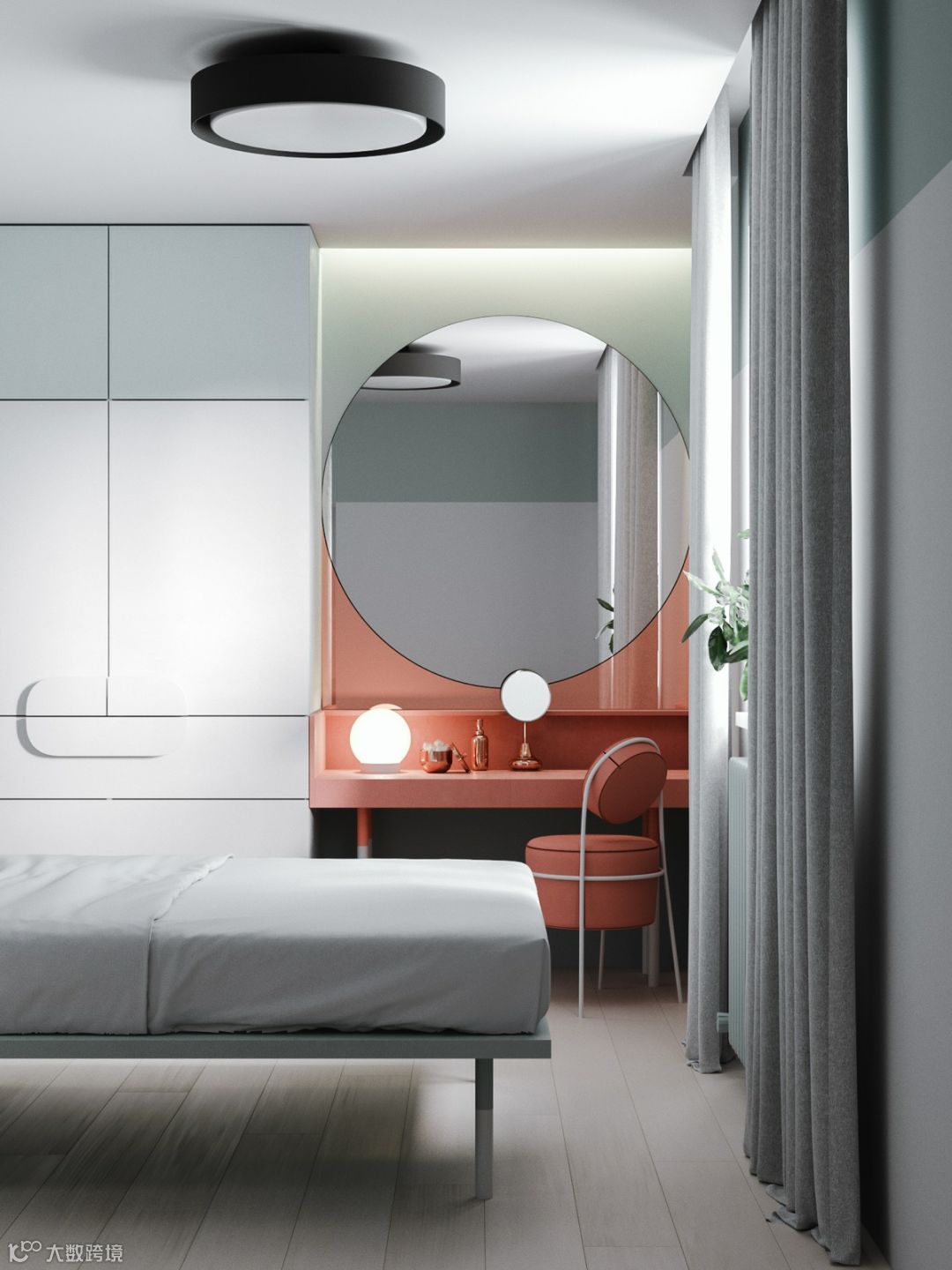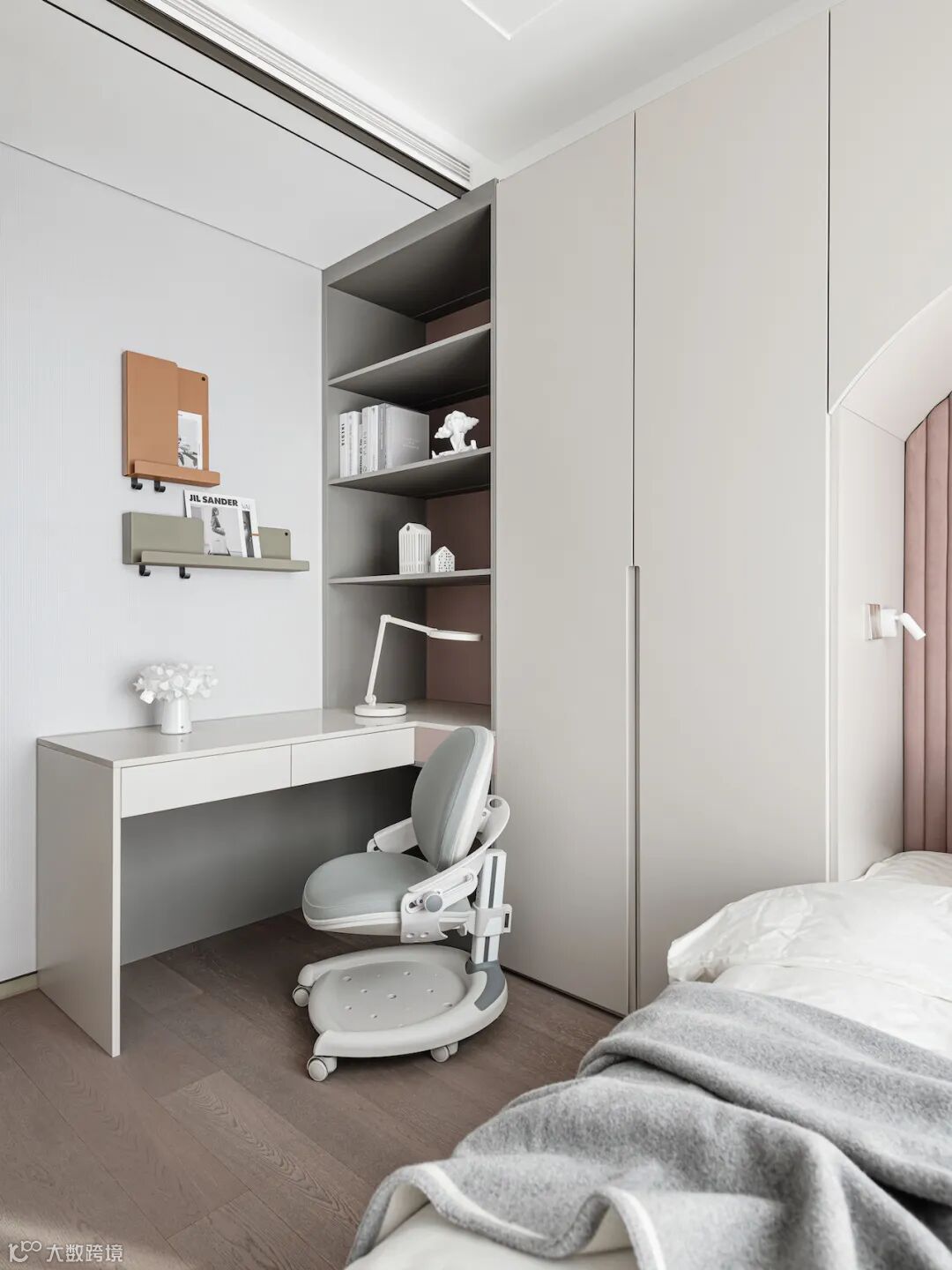 在现代家庭中,不建议单独买柜子,根据空间的尺寸定制整体衣柜,可以大大提高卧室的使用率,还可以加入梳妆台、书桌等功能。