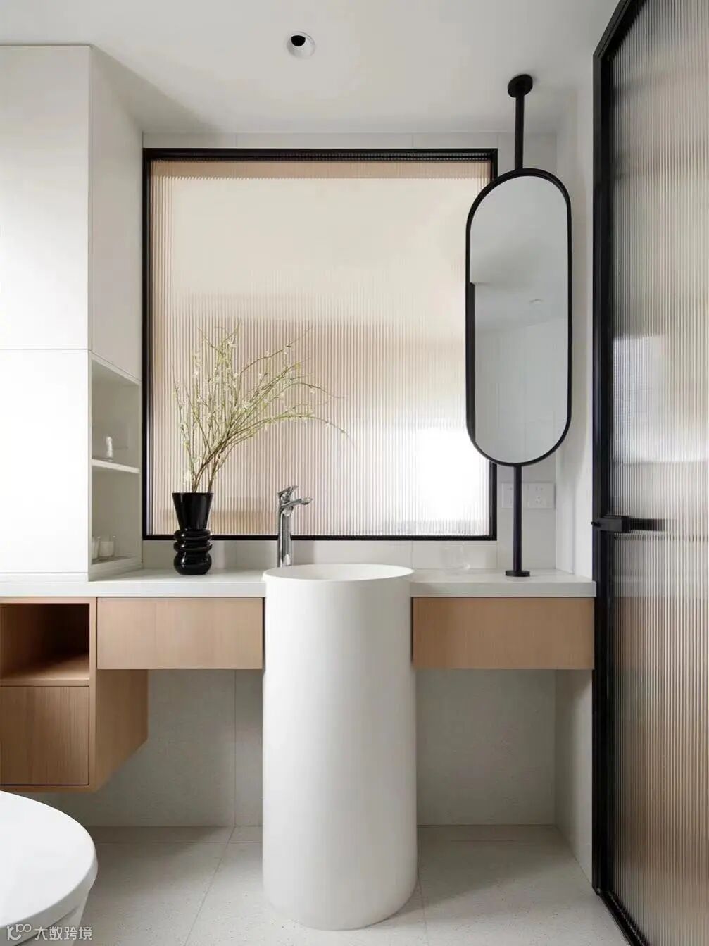 在卫生间买成品柜,容易发潮、发霉。其实在卫生间角落处,加入一些简易的开放式的搁板就可以啦,把我们常用的洗漱用品都放在边角柜上,非常便捷好用。