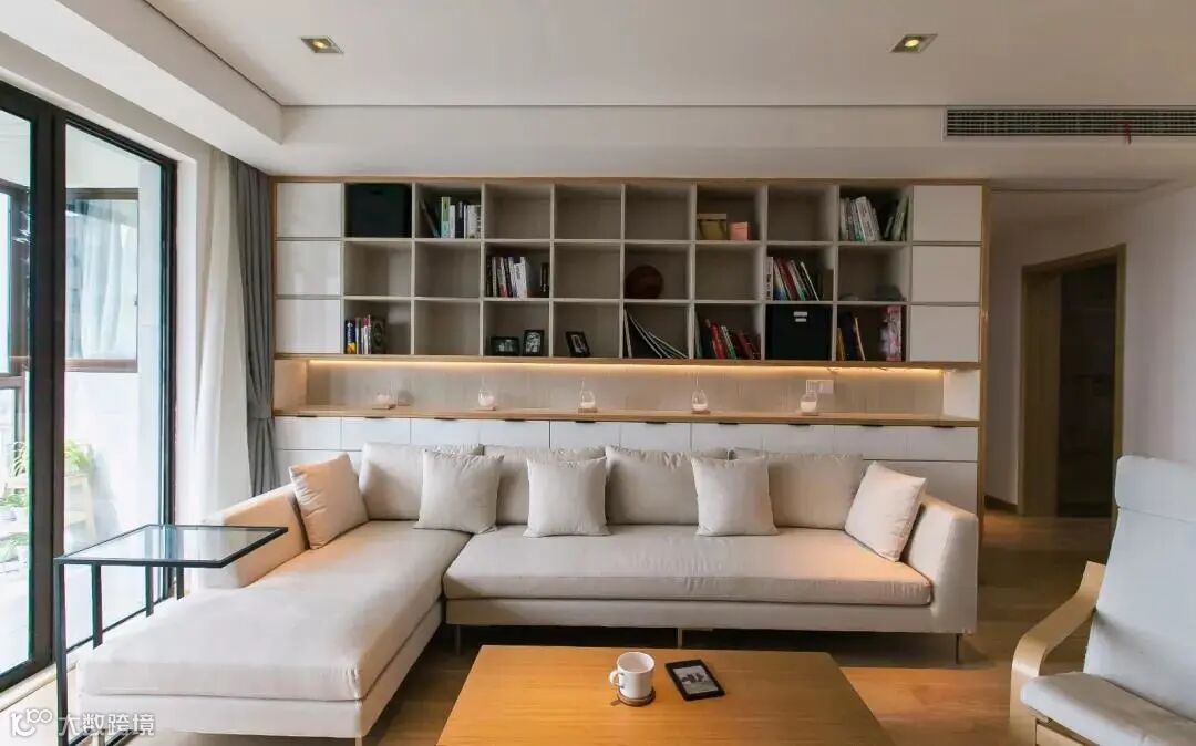 半墙式的展示书架。客厅沙发墙装了一排的储物柜,做了半墙式的,摆上书籍与装饰品,在一排灯带的映衬下,显得温馨而又有层次感。